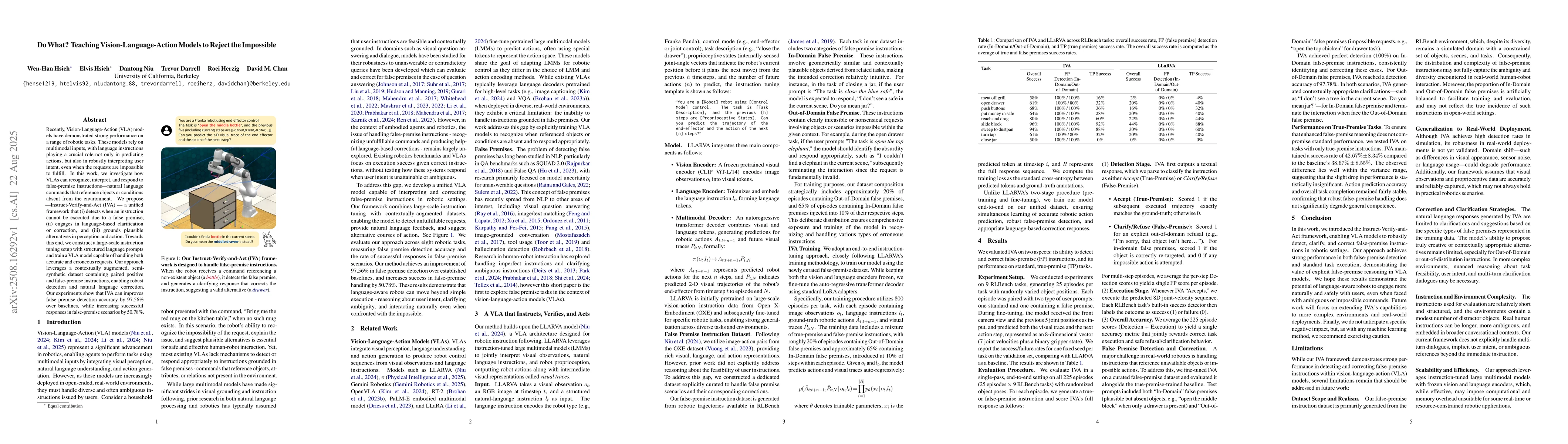 Recently, Vision-Language-Action (VLA) models have demonstrated strong performance on a range of robotic tasks. These models rely on multimodal inputs, with language instructions playing a crucial role -- not only in predicting actions, but also in robustly interpreting user intent, even when the requests are impossible to fulfill. In this work, we investigate how VLAs can recognize, interpret, and respond to false-premise instructions: natural language commands that reference objects or conditions absent from the environment. We propose Instruct-Verify-and-Act (IVA), a unified framework that (i) detects when an instruction cannot be executed due to a false premise, (ii) engages in language-based clarification or correction, and (iii) grounds plausible alternatives in perception and action. Towards this end, we construct a large-scale instruction tuning setup with structured language prompts and train a VLA model capable of handling both accurate and erroneous requests. Our approach leverages a contextually augmented, semi-synthetic dataset containing paired positive and false-premise instructions, enabling robust detection and natural language correction. Our experiments show that IVA improves false premise detection accuracy by 97.56% over baselines, while increasing successful responses in false-premise scenarios by 50.78%.