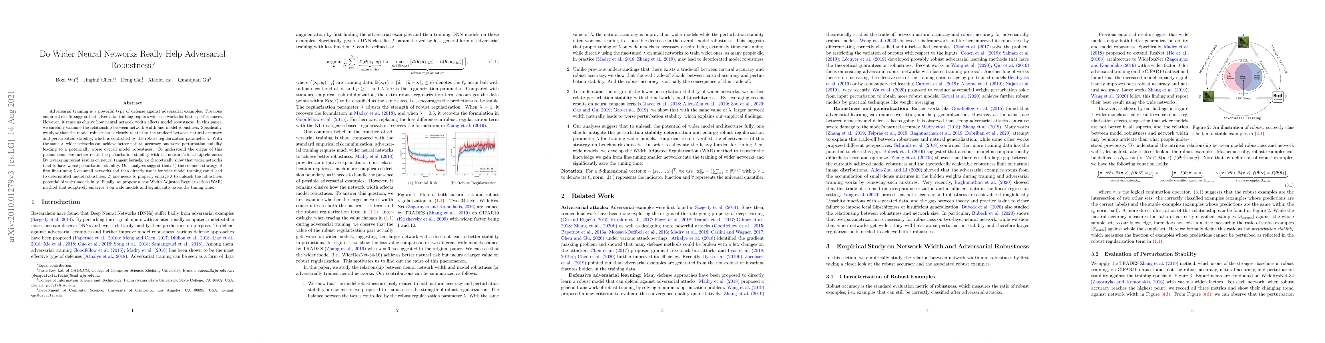 This paper investigates the relationship between neural network width and adversarial robustness, revealing that wider networks can achieve better natural accuracy but worse perturbation stability, leading to potential overall robustness deterioration. The authors propose a new Width Adjusted Regularization (WAR) method to adaptively enhance the robustness potential of wider models.
