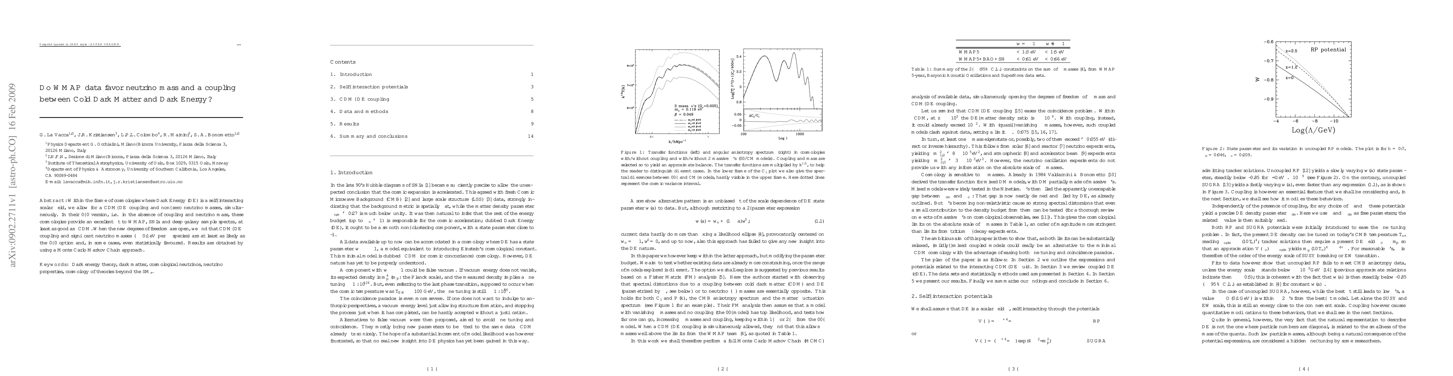 Within the frame of cosmologies where Dark Energy (DE) is a self--interacting scalar field, we allow for a CDM--DE coupling and non--zero neutrino masses, simultaneously. In their 0--0 version, i.e. in the absence of coupling and neutrino mass, these cosmologies provide an excellent fit to WMAP, SNIa and deep galaxy sample spectra, at least as good as \LambdaCDM. When the new degrees of freedom are open, we find that CDM--DE coupling and significant neutrino masses (~0.1eV per \nu species) are at least as likely as the 0--0 option and, in some cases, even statistically favoured. Results are obtained by using a Monte Carlo Markov Chain approach.