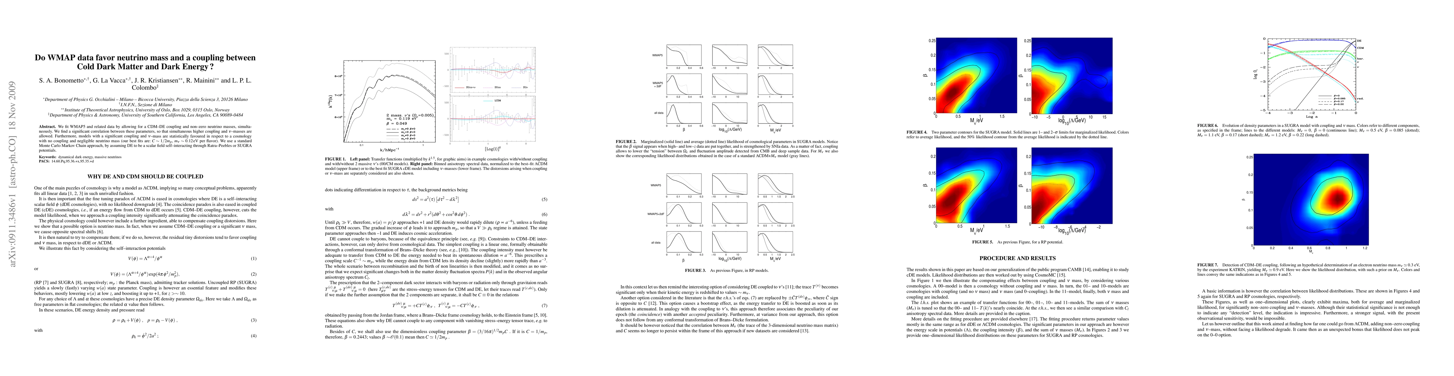 We fit WMAP5 and related data by allowing for a CDM--DE coupling and non--zero neutrino masses, simultaneously. We find a significant correlation between these parameters, so that simultaneous higher coupling and \nu--masses are allowed. Furthermore, models with a significant coupling and \nu--mass are statistically favoured in respect to a cosmology with no coupling and negligible neutrino mass (our best fits are: C ~ 1/2m_p, m_\nu ~ 0.12eV per flavor). We use a standard Monte Carlo Markov Chain approach, by assuming DE to be a scalar field self--interacting through Ratra--Peebles or SUGRA potentials.