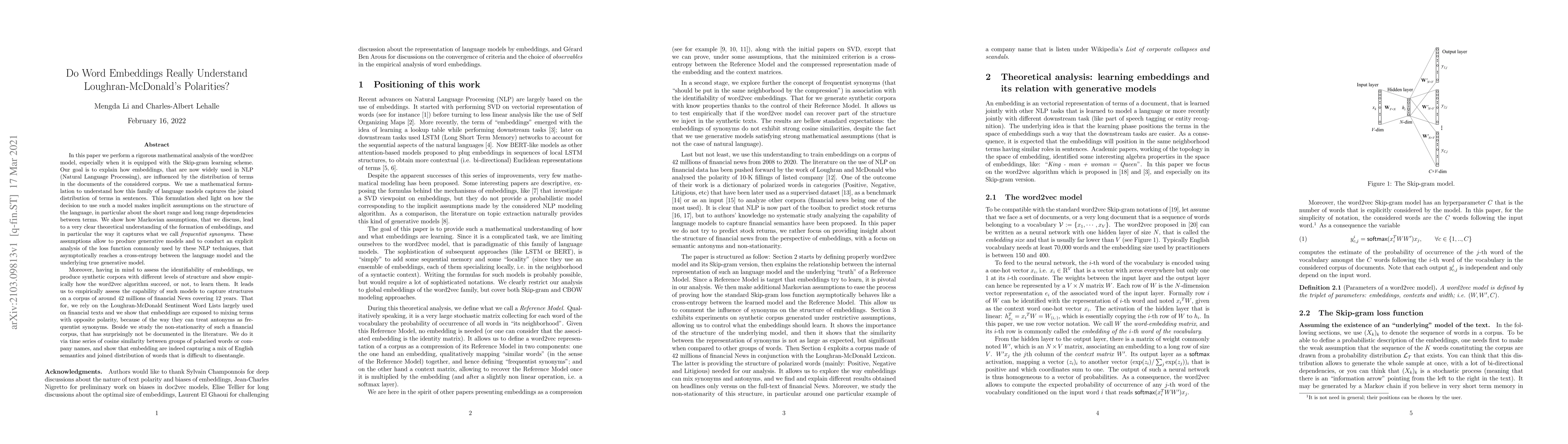 In this paper we perform a rigorous mathematical analysis of the word2vec model, especially when it is equipped with the Skip-gram learning scheme. Our goal is to explain how embeddings, that are now widely used in NLP (Natural Language Processing), are influenced by the distribution of terms in the documents of the considered corpus. We use a mathematical formulation to shed light on how the decision to use such a model makes implicit assumptions on the structure of the language. We show how Markovian assumptions, that we discuss, lead to a very clear theoretical understanding of the formation of embeddings, and in particular the way it captures what we call frequentist synonyms. These assumptions allow to produce generative models and to conduct an explicit analysis of the loss function commonly used by these NLP techniques. Moreover, we produce synthetic corpora with different levels of structure and show empirically how the word2vec algorithm succeed, or not, to learn them. It leads us to empirically assess the capability of such models to capture structures on a corpus of around 42 millions of financial News covering 12 years. That for, we rely on the Loughran-McDonald Sentiment Word Lists largely used on financial texts and we show that embeddings are exposed to mixing terms with opposite polarity, because of the way they can treat antonyms as frequentist synonyms. Beside we study the non-stationarity of such a financial corpus, that has surprisingly not be documented in the literature. We do it via time series of cosine similarity between groups of polarized words or company names, and show that embedding are indeed capturing a mix of English semantics and joined distribution of words that is difficult to disentangle.