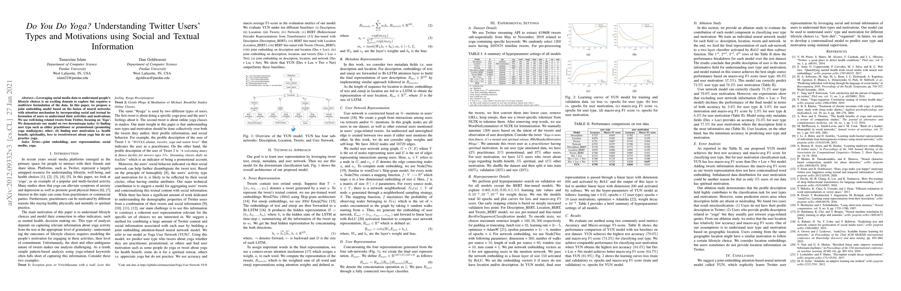 This paper proposes a joint embedding model that fuses neural networks with attention mechanisms to analyze social and textual information from Twitter users' tweets about yoga. The model aims to classify users into types (practitioner, promoter, other) and identify their motivations (health, spirituality, etc.).