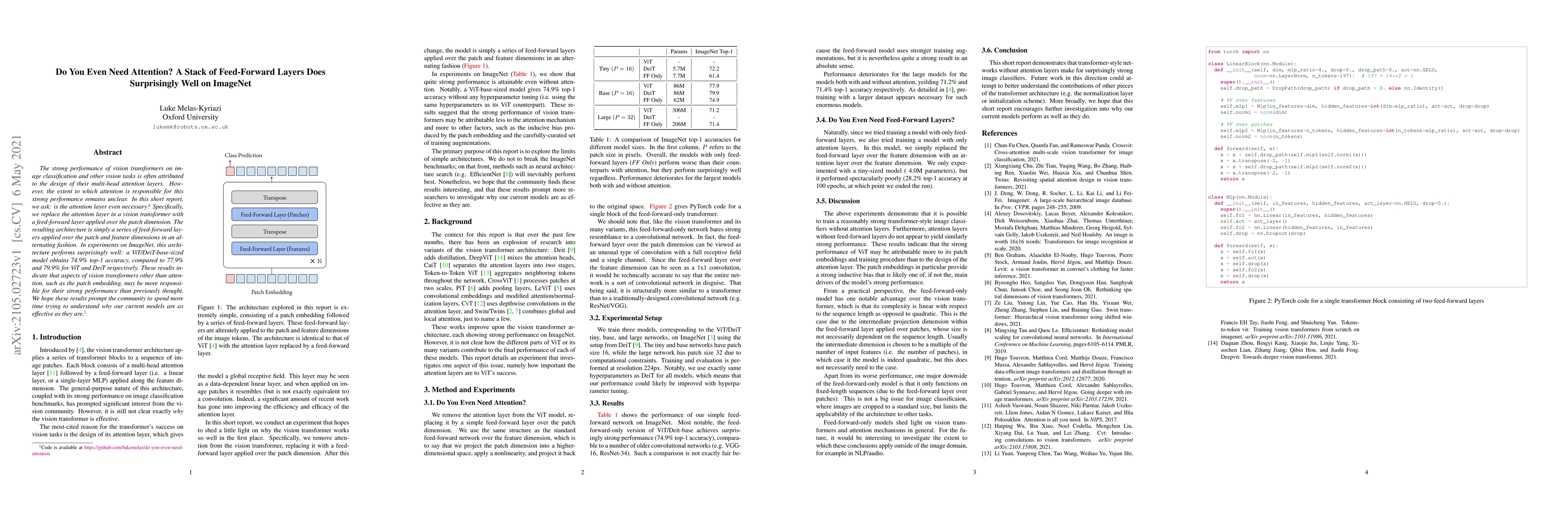 This paper investigates whether attention layers in vision transformers are essential for their strong performance, finding that a stack of feed-forward layers can achieve 74.9% top-1 accuracy on ImageNet, close to the 77.9% and 79.9% of traditional vision transformers. The results suggest that factors beyond attention, like patch embedding, may be more influential.