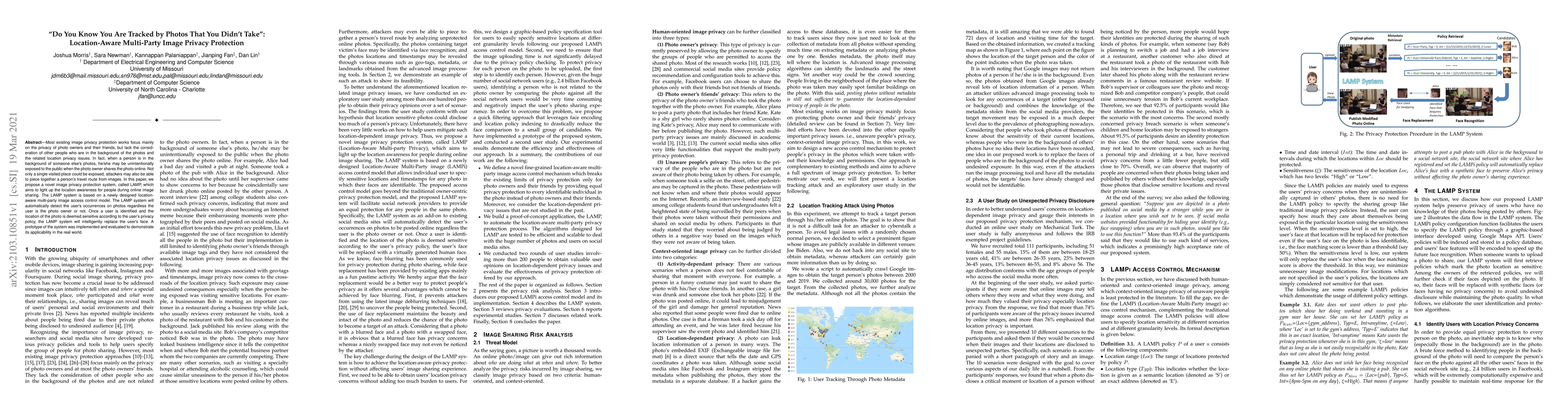 A new image privacy protection system called LAMP is proposed to protect people's location awareness when sharing photos online, replacing faces in sensitive images to prevent unauthorized exposure.