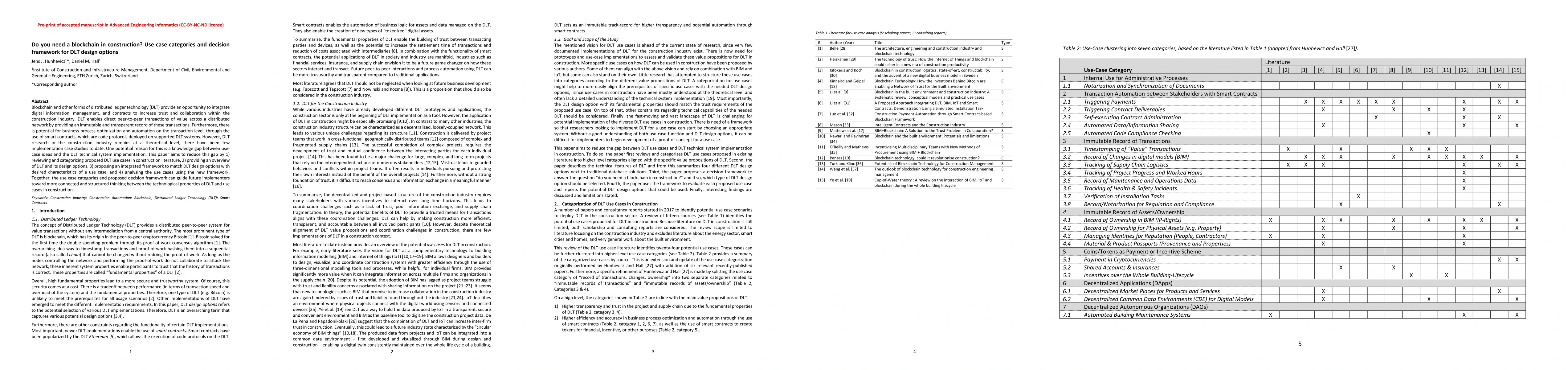 Blockchain and other forms of distributed ledger technology (DLT) provide an opportunity to integrate digital information, management, and contracts to increase trust and collaboration within the construction industry. DLT enables direct peer-to-peer transactions of value across a distributed network by providing an immutable and transparent record of these transactions. Furthermore, there is potential for business process optimization and automation on the transaction level, through the use of smart contracts, which are code protocols deployed on supported DLT systems. However, DLT research in the construction industry remains at a theoretical level; there have been few implementation case studies to date. One potential reason for this is a knowledge gap between use-case ideas and the DLT technical system implementation. This paper aims to reduce this gap by 1) reviewing and categorizing proposed DLT use cases in construction literature, 2) providing an overview of DLT and its design options, 3) proposing an integrated framework to match DLT design options with desired characteristics of a use case, and 4) analysing the use cases using the new framework. Together, the use case categories and proposed decision framework can guide future implementers toward more connected and structured thinking between the technological properties of DLT and use cases in construction.