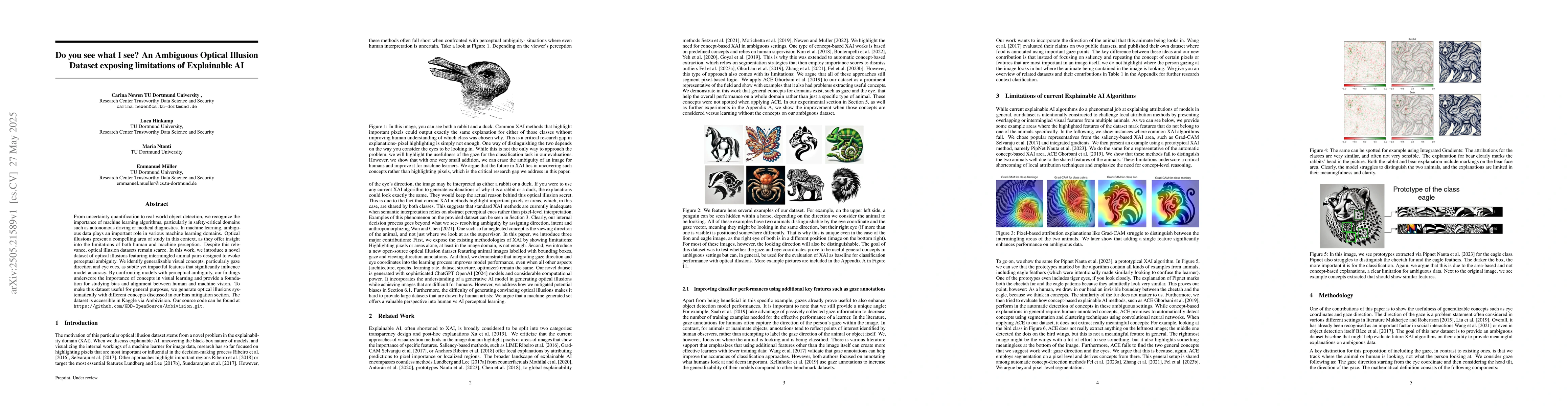 The paper introduces a novel dataset of optical illusions featuring intermingled animal pairs to study perceptual ambiguity, identifying gaze direction and eye cues as impactful features for model accuracy.