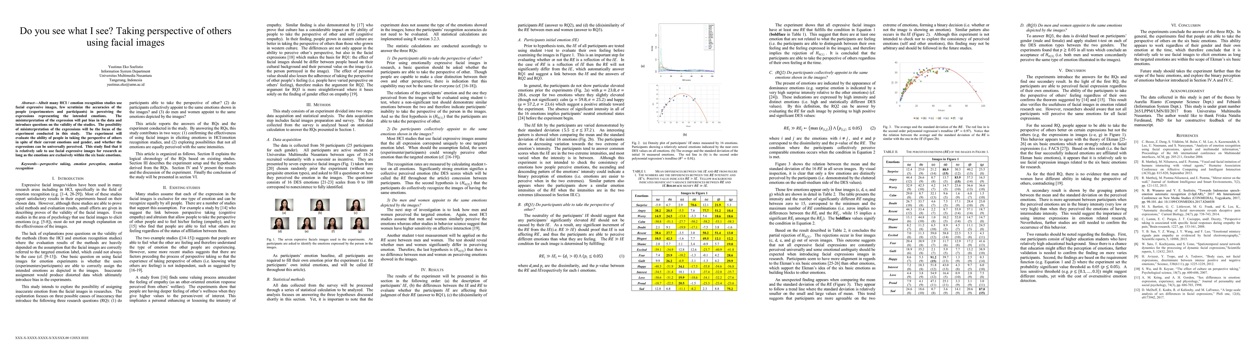 Albeit many HCI / emotion recognition studies use facial expressive images, few scrutinize the accuracies of the people (experimenters and participants) in perceiving the expressions representing the intended emotions. The misinterpretation of the expression will put bias in the data and introduce questions on the validity of the studies. The possibility of misinterpretation of the expressions will be the focus of the experiment conducted in this study. The experiment will evaluate the ability of people in taking the perspective of others in spite of their current emotions and gender, and whether the expressions can be universally perceived. This study find that it is relatively safe to use facial expressive images for research as long as the emotions are exclusively within the six basic emotions.