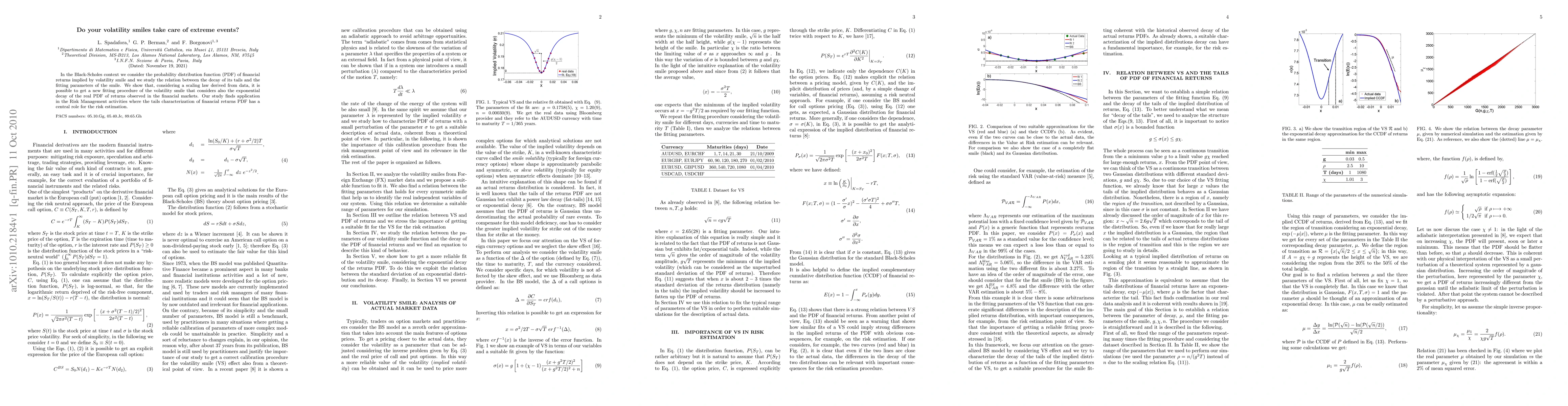 In the Black-Scholes context we consider the probability distribution function (PDF) of financial returns implied by volatility smile and we study the relation between the decay of its tails and the fitting parameters of the smile. We show that, considering a scaling law derived from data, it is possible to get a new fitting procedure of the volatility smile that considers also the exponential decay of the real PDF of returns observed in the financial markets. Our study finds application in the Risk Management activities where the tails characterization of financial returns PDF has a central role for the risk estimation.