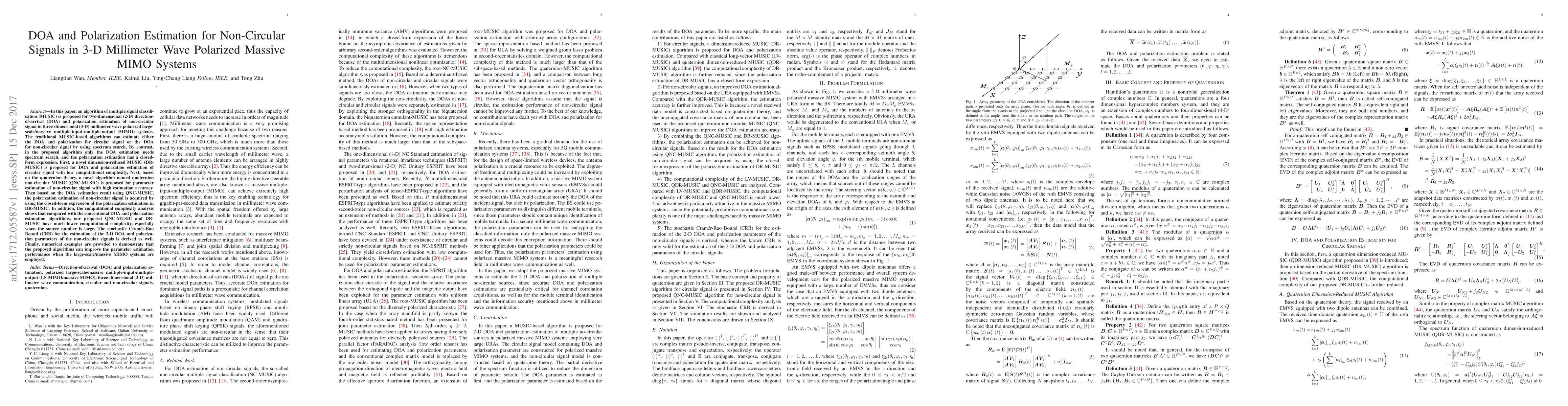 In this paper, an algorithm of multiple signal classification (MUSIC) is proposed for two-dimensional (2-D) direction of- arrival (DOA) and polarization estimation of non-circular signal in three-dimensional (3-D) millimeter wave polarized largescale/ massive multiple-input-multiple-output (MIMO) systems. The traditional MUSIC-based algorithms can estimate either the DOA and polarization for circular signal or the DOA for non-circular signal by using spectrum search. By contrast, in the proposed algorithm only the DOA estimation needs spectrum search, and the polarization estimation has a closedform expression. First, a novel dimension-reduced MUSIC (DRMUSIC) is proposed for DOA and polarization estimation of circular signal with low computational complexity. Next, based on the quaternion theory, a novel algorithm named quaternion non-circular MUSIC (QNC-MUSIC) is proposed for parameter estimation of non-circular signal with high estimation accuracy. Then based on the DOA estimation result using QNC-MUSIC, the polarization estimation of non-circular signal is acquired by using the closed-form expression of the polarization estimation in DR-MUSIC. In addition, the computational complexity analysis shows that compared with the conventional DOA and polarization estimation algorithms, our proposed QNC-MUSIC and DRMUSIC have much lower computational complexity, especially when the source number is large. The stochastic Cramer-Rao Bound (CRB) for the estimation of the 2-D DOA and polarization parameters of the non-circular signals is derived as well. Finally, numerical examples are provided to demonstrate that the proposed algorithms can improve the parameter estimation performance when the large-scale/massive MIMO systems are employed.