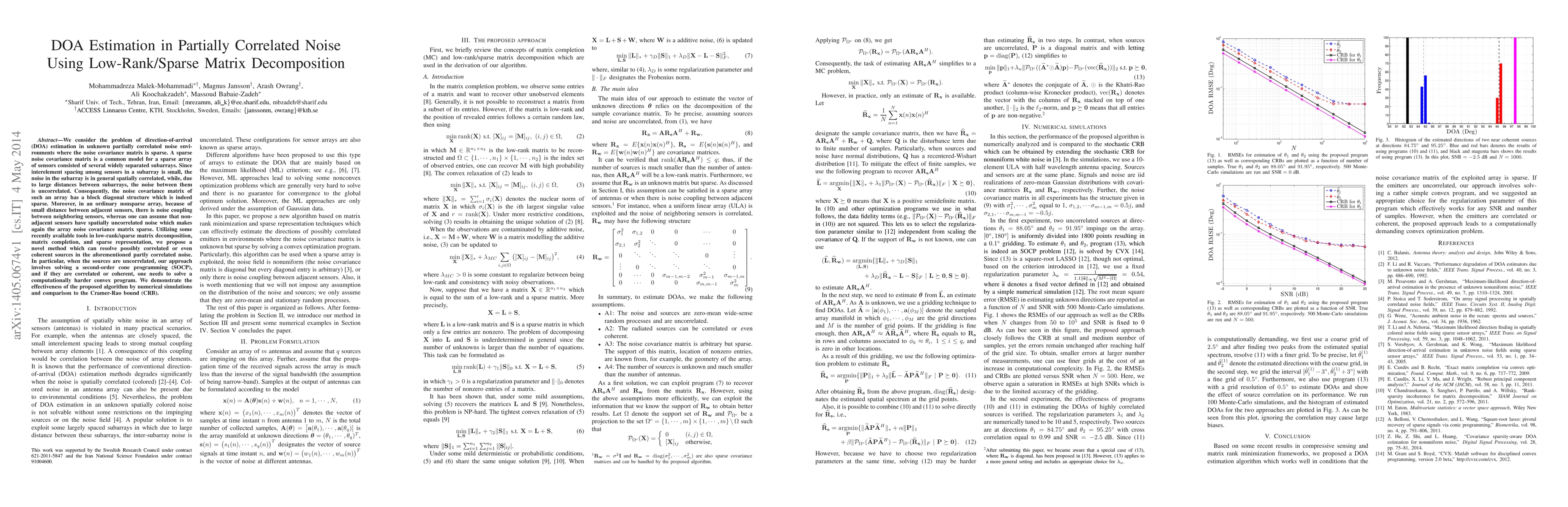 This paper proposes a novel method for direction-of-arrival (DOA) estimation in partially correlated noise using low-rank/sparse matrix decomposition. The method leverages the sparse structure of the noise covariance matrix in sparse arrays and solves either a second-order cone programming or a convex program depending on source correlation.