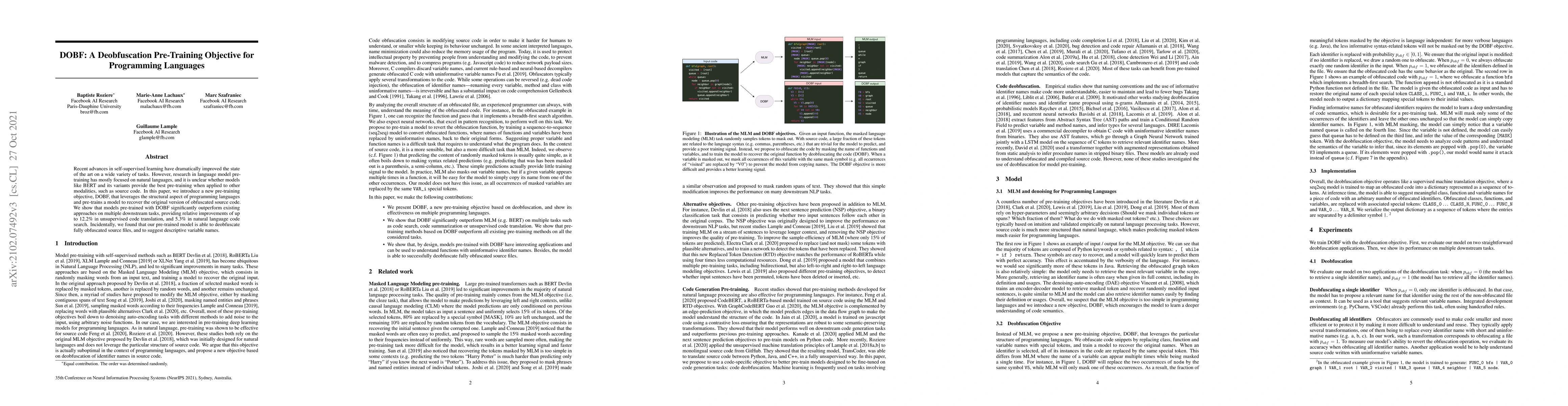This paper introduces DOBF, a novel pre-training objective for programming languages that aims to recover obfuscated source code, significantly improving performance on tasks like unsupervised code translation and natural language code search. Models pre-trained with DOBF achieve up to 13% better results in code translation and 24% in code search compared to existing methods.