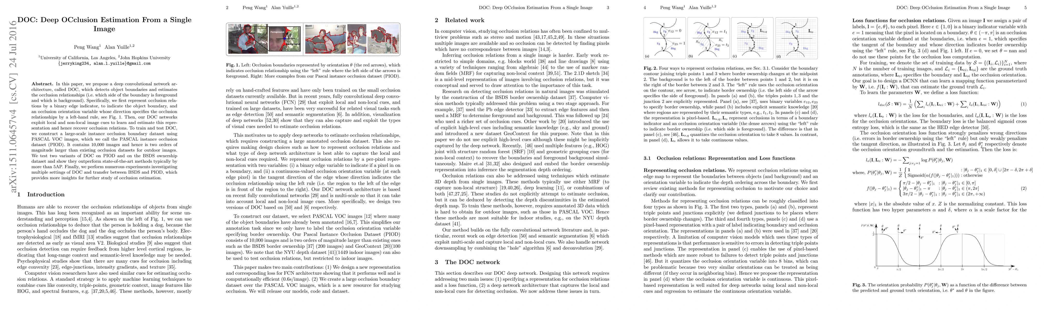 This paper proposes a deep network architecture called DOC to estimate occlusion relationships from a single image, detecting object boundaries and determining border ownership. The authors train and test their model on a large-scale instance occlusion boundary dataset, showing superior performance compared to existing methods.