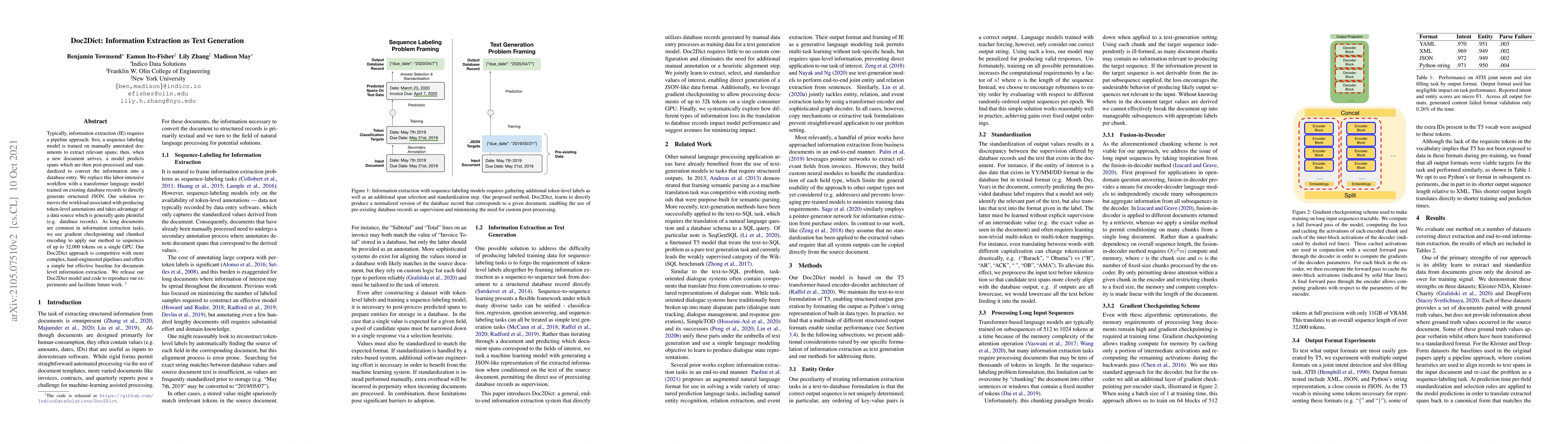Typically, information extraction (IE) requires a pipeline approach: first, a sequence labeling model is trained on manually annotated documents to extract relevant spans; then, when a new document arrives, a model predicts spans which are then post-processed and standardized to convert the information into a database entry. We replace this labor-intensive workflow with a transformer language model trained on existing database records to directly generate structured JSON. Our solution removes the workload associated with producing token-level annotations and takes advantage of a data source which is generally quite plentiful (e.g. database records). As long documents are common in information extraction tasks, we use gradient checkpointing and chunked encoding to apply our method to sequences of up to 32,000 tokens on a single GPU. Our Doc2Dict approach is competitive with more complex, hand-engineered pipelines and offers a simple but effective baseline for document-level information extraction. We release our Doc2Dict model and code to reproduce our experiments and facilitate future work.