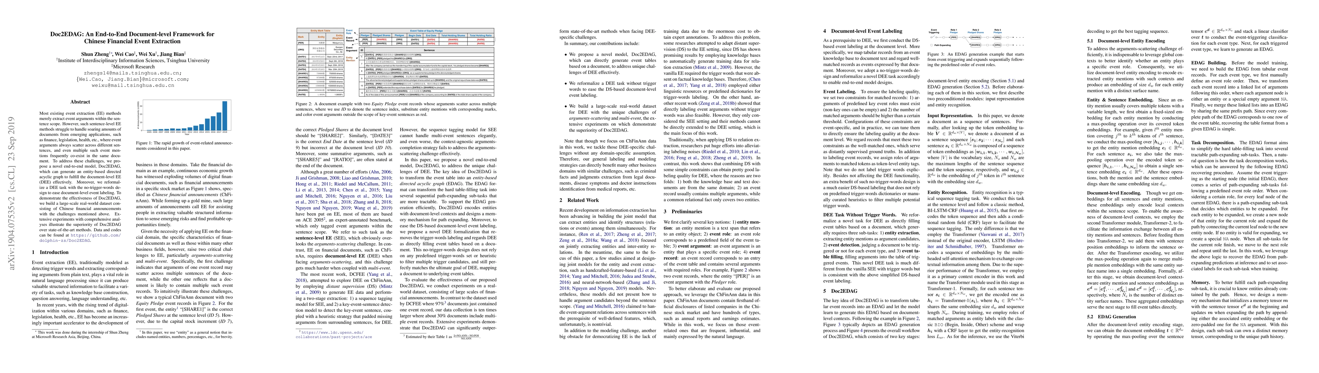 The paper introduces Doc2EDAG, an end-to-end framework for document-level Chinese financial event extraction, addressing the limitations of sentence-level EE methods by generating an entity-based directed acyclic graph. The model outperforms existing methods, as demonstrated through experiments on a new dataset of Chinese financial announcements.