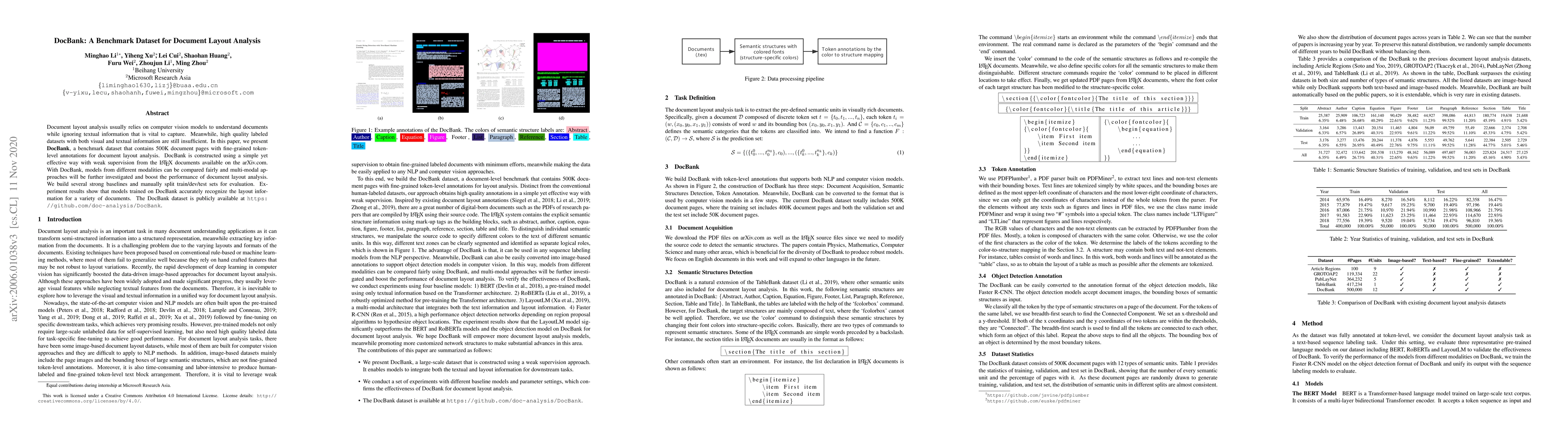 DocBank is a new benchmark dataset for document layout analysis, featuring 500K pages with fine-grained token-level annotations, aiming to bridge the gap between visual and textual information. The dataset enables fair comparisons of models and supports multi-modal approaches to improve document layout analysis.