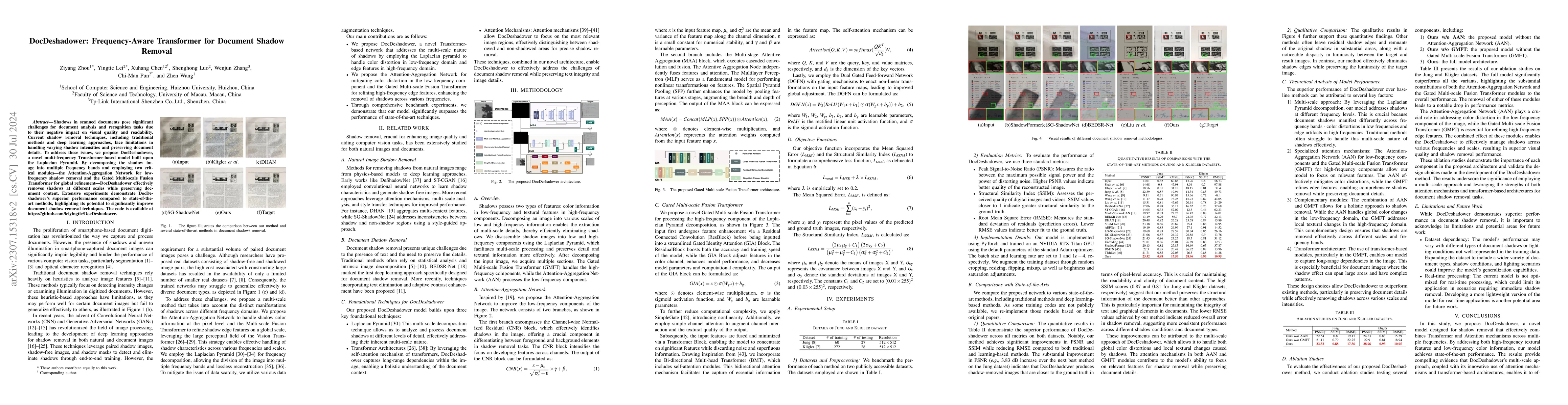 DocDeshadower is a novel Transformer-based model that employs Laplacian Pyramid to remove shadows from scanned documents by addressing different frequency bands. It combines an Attention-Aggregation Network and a Gated Multi-scale Fusion Transformer for effective shadow removal, outperforming existing methods.