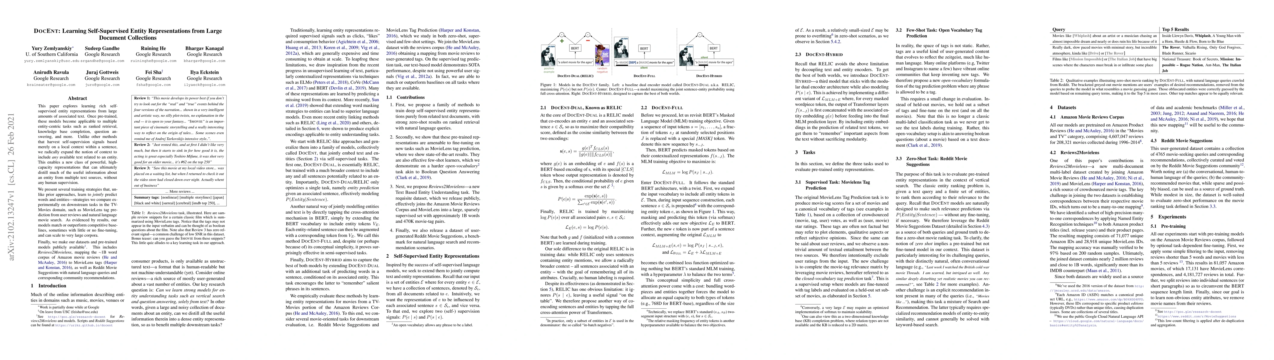 This paper introduces DOCENT, a method for learning self-supervised entity representations from large document collections by leveraging broader contextual information. The proposed models outperform baselines on various entity-centric tasks and are made publicly available along with datasets.