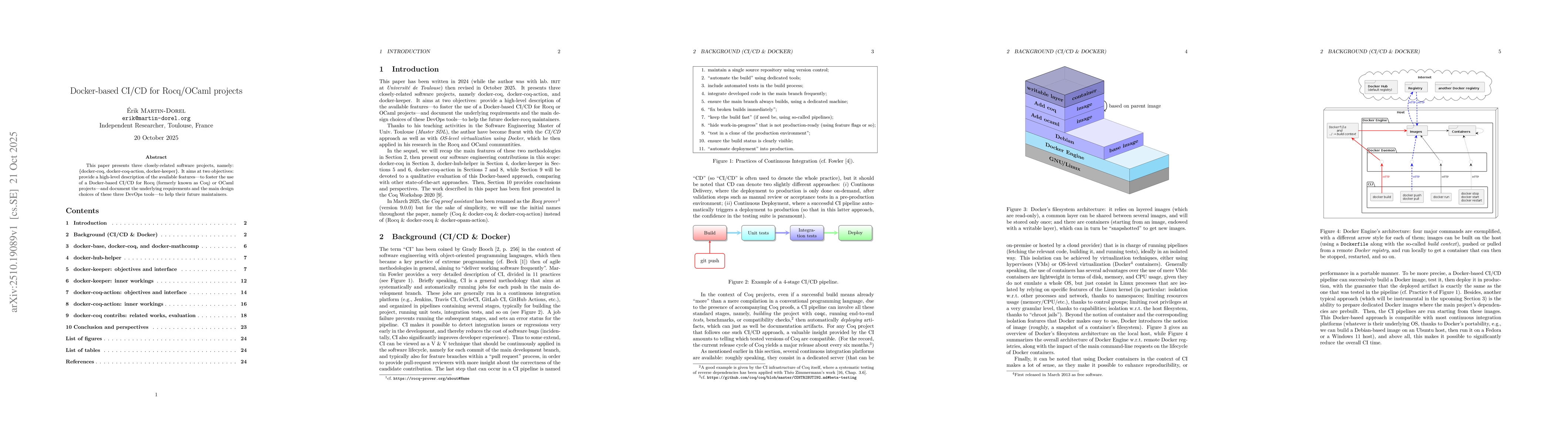 The development of docker-keeper as a GitLab CI compiler for managing multi-branch builds and the docker-coq-action as a GitHub Action for Coq projects represent key technical contributions.