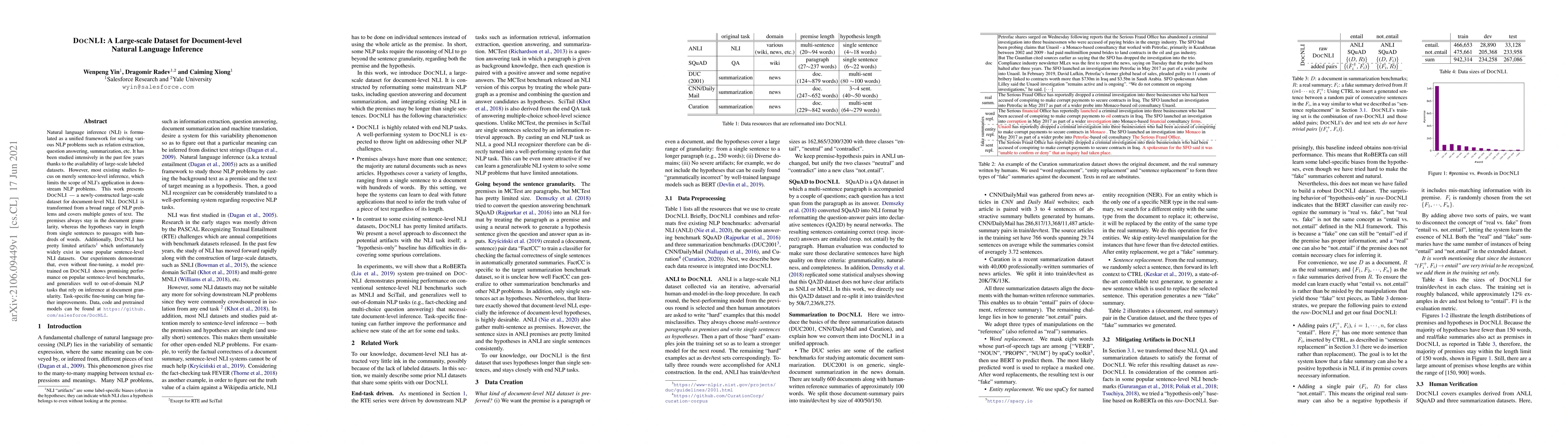 DocNLI is a newly constructed large-scale dataset for document-level natural language inference, addressing the limitation of sentence-level datasets by encompassing multiple text genres and document-sized premises. It demonstrates promising performance on sentence-level benchmarks and generalizes well to out-of-domain NLP tasks.