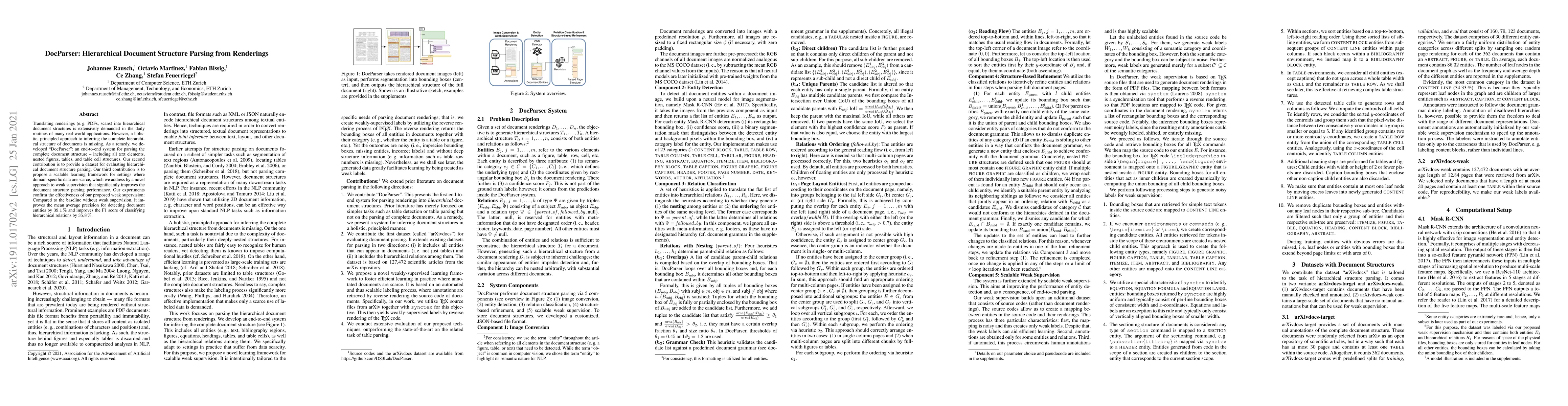 "DocParser" is an end-to-end system designed to parse the complete hierarchical structure of documents, including text elements, figures, tables, and their nested structures. The system also introduces a scalable learning framework for scenarios with limited domain-specific data, leveraging weak supervision to significantly enhance parsing performance.