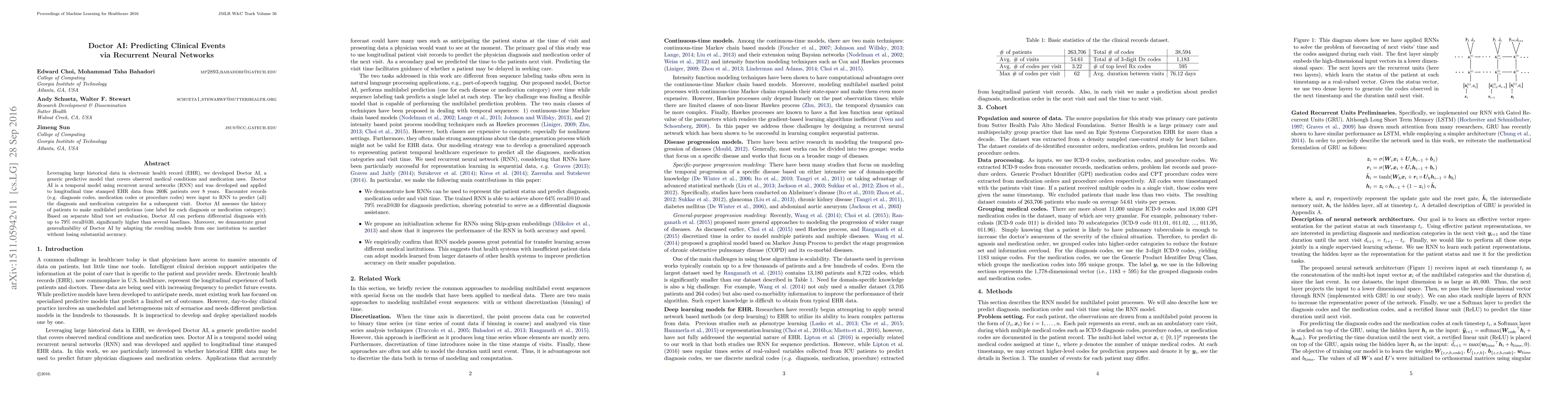 Doctor AI uses recurrent neural networks to predict clinical events from longitudinal electronic health records, achieving up to 79% recall@30 for differential diagnosis, and demonstrating high generalizability across different institutions.