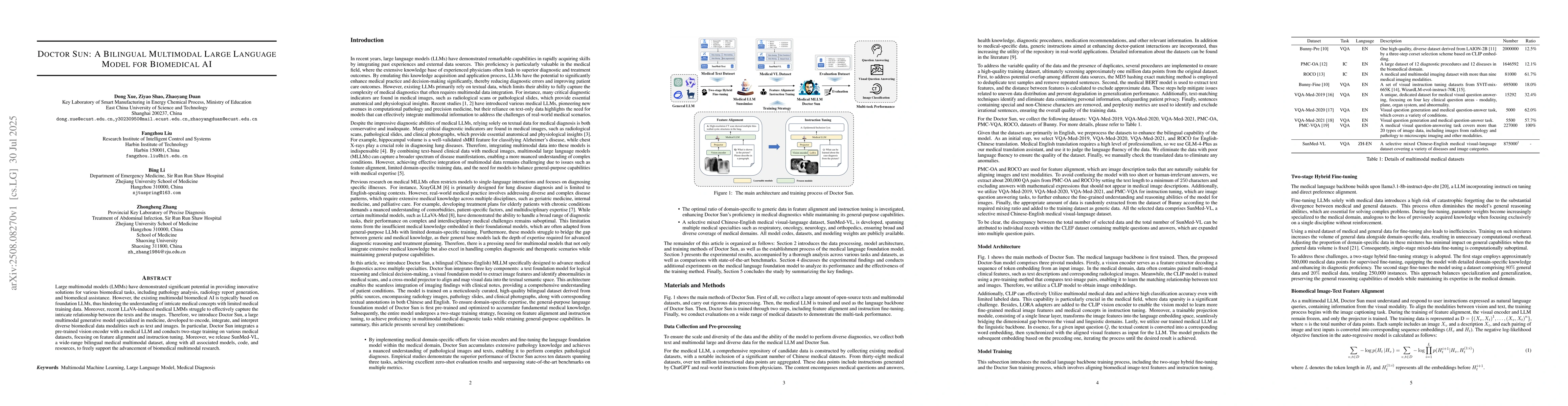 Doctor Sun, a bilingual multimodal large language model, and SunMed-VL, a wide-range bilingual medical multimodal dataset, are the main technical contributions.