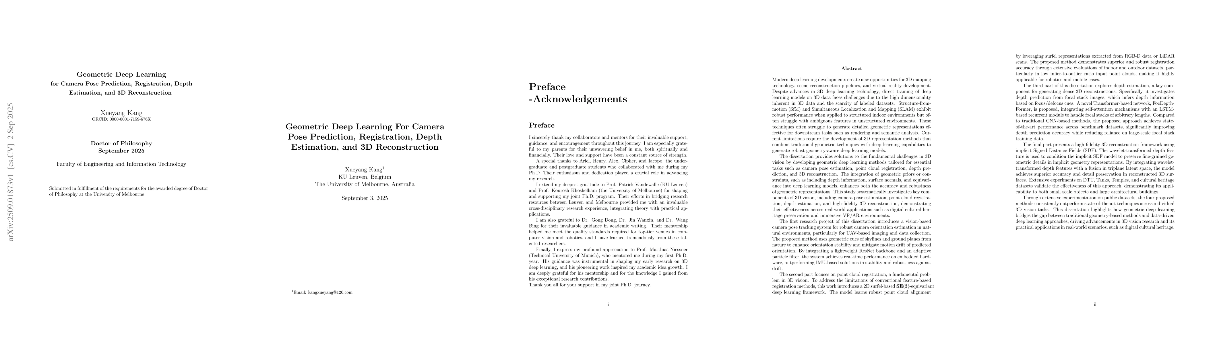 Modern deep learning developments create new opportunities for 3D mapping technology, scene reconstruction pipelines, and virtual reality development. Despite advances in 3D deep learning technology, direct training of deep learning models on 3D data faces challenges due to the high dimensionality inherent in 3D data and the scarcity of labeled datasets. Structure-from-motion (SfM) and Simultaneous Localization and Mapping (SLAM) exhibit robust performance when applied to structured indoor environments but often struggle with ambiguous features in unstructured environments. These techniques often struggle to generate detailed geometric representations effective for downstream tasks such as rendering and semantic analysis. Current limitations require the development of 3D representation methods that combine traditional geometric techniques with deep learning capabilities to generate robust geometry-aware deep learning models. The dissertation provides solutions to the fundamental challenges in 3D vision by developing geometric deep learning methods tailored for essential tasks such as camera pose estimation, point cloud registration, depth prediction, and 3D reconstruction. The integration of geometric priors or constraints, such as including depth information, surface normals, and equivariance into deep learning models, enhances both the accuracy and robustness of geometric representations. This study systematically investigates key components of 3D vision, including camera pose estimation, point cloud registration, depth estimation, and high-fidelity 3D reconstruction, demonstrating their effectiveness across real-world applications such as digital cultural heritage preservation and immersive VR/AR environments.
