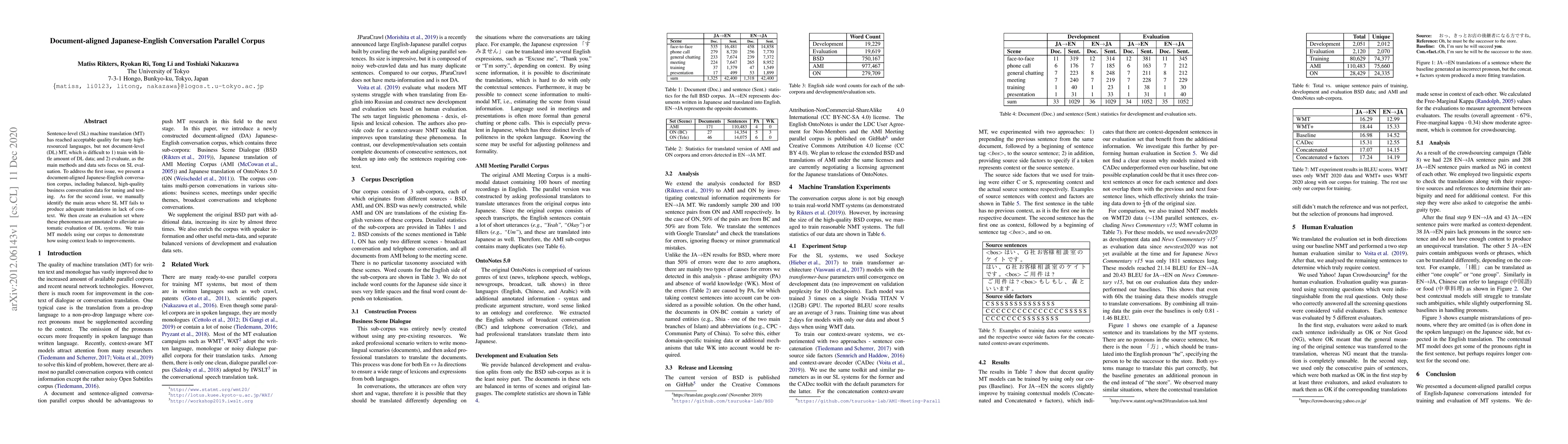 This paper introduces a document-aligned Japanese-English conversation corpus to improve document-level machine translation, addressing the scarcity of such data and the challenges in evaluation. The authors also develop an annotated evaluation set to better assess the context-dependent performance of translation models.