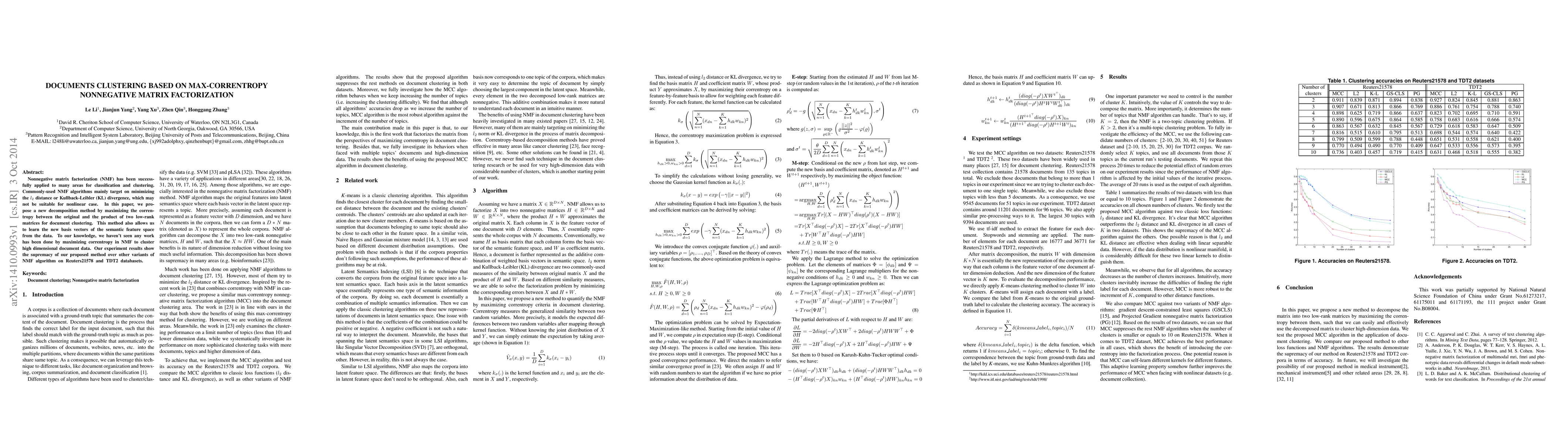 This paper proposes a novel max-correntropy NMF method for document clustering, which maximizes correntropy instead of traditional $l_2$ distance or KL divergence, showing superior performance on Reuters21578 and TDT2 datasets compared to other NMF variants.