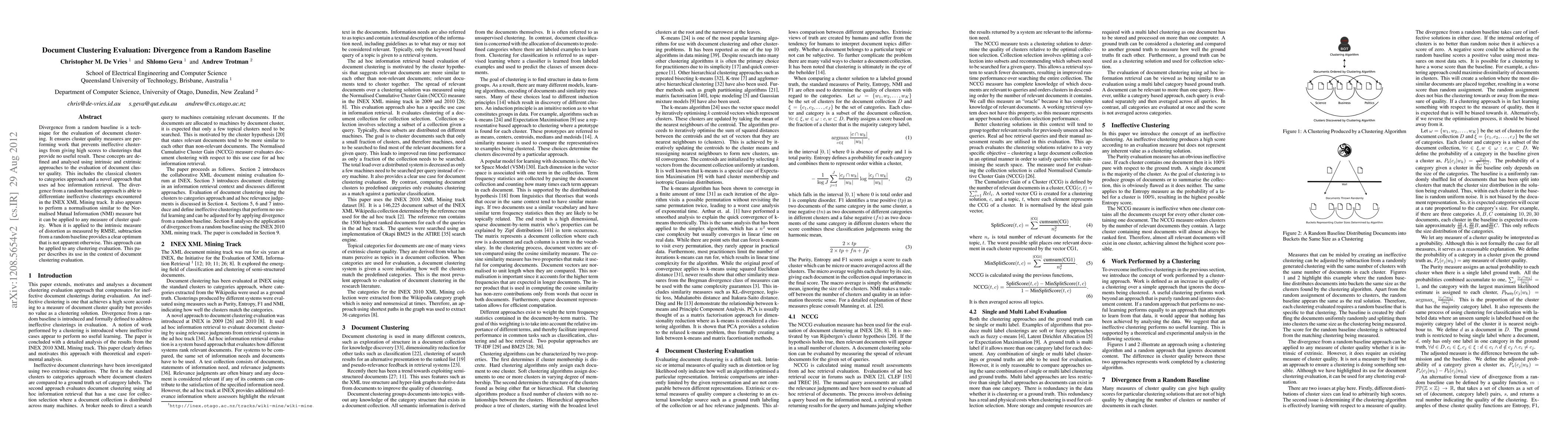 Divergence from a random baseline is a technique for the evaluation of document clustering. It ensures cluster quality measures are performing work that prevents ineffective clusterings from giving high scores to clusterings that provide no useful result. These concepts are defined and analysed using intrinsic and extrinsic approaches to the evaluation of document cluster quality. This includes the classical clusters to categories approach and a novel approach that uses ad hoc information retrieval. The divergence from a random baseline approach is able to differentiate ineffective clusterings encountered in the INEX XML Mining track. It also appears to perform a normalisation similar to the Normalised Mutual Information (NMI) measure but it can be applied to any measure of cluster quality. When it is applied to the intrinsic measure of distortion as measured by RMSE, subtraction from a random baseline provides a clear optimum that is not apparent otherwise. This approach can be applied to any clustering evaluation. This paper describes its use in the context of document clustering evaluation.
