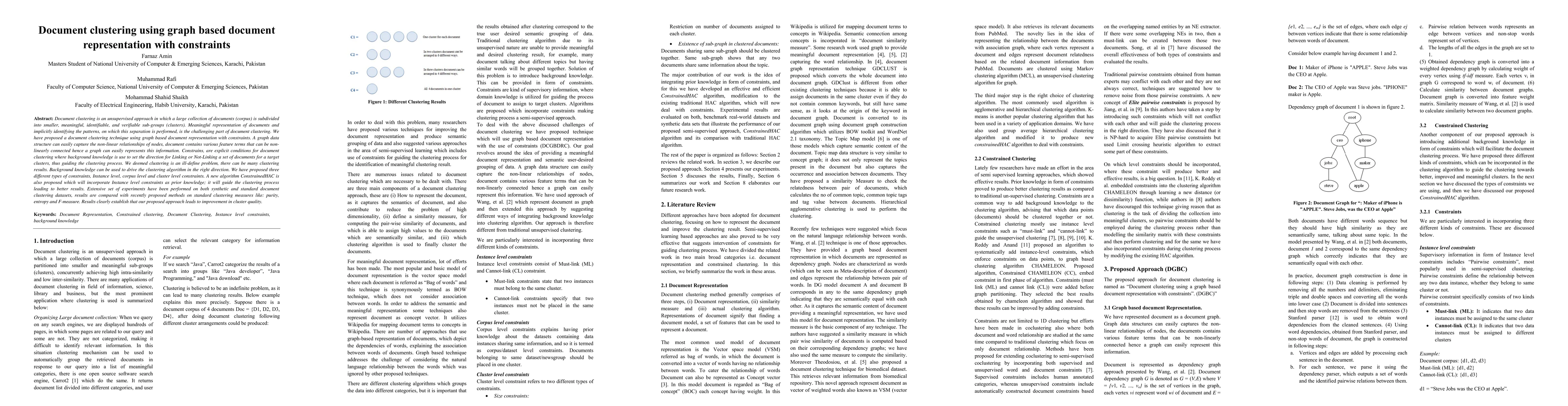 This paper proposes a document clustering technique using graph-based document representation with constraints to improve cluster quality. The approach incorporates instance, corpus, and cluster level constraints to guide the clustering process, leading to better results as demonstrated through experiments on synthetic and standard datasets.