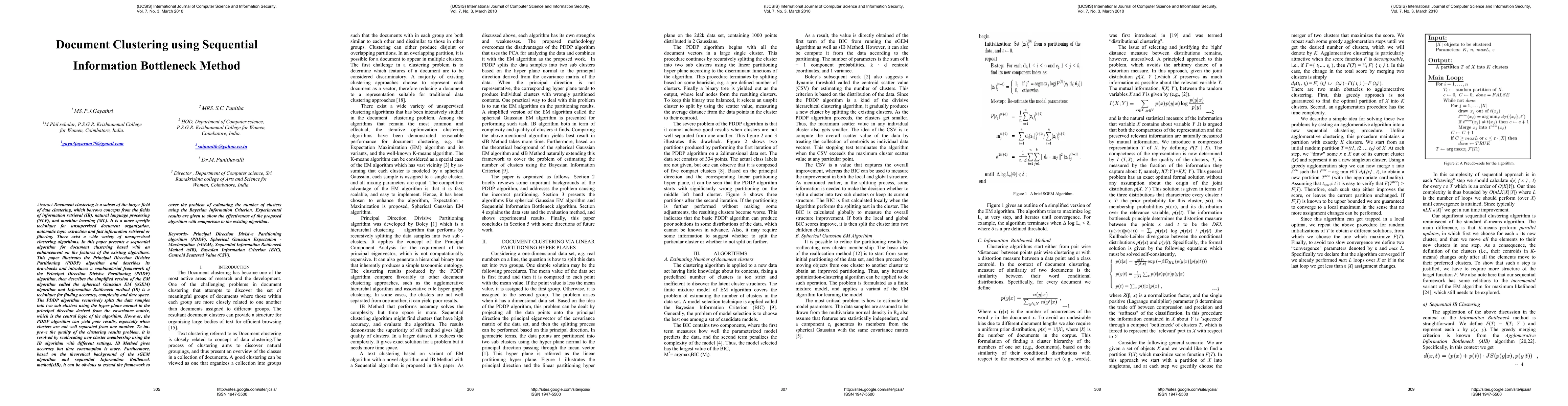 This paper proposes a combinatorial framework combining the Principal Direction Divisive Partitioning (PDDP) algorithm with the Information Bottleneck method (IB) and a simplified EM algorithm (sGEM) to improve document clustering. The PDDP algorithm's limitations in poorly separated clusters are addressed by the IB method, though it increases computational time. Experimental results demonstrate the effectiveness of the proposed method compared to existing algorithms.