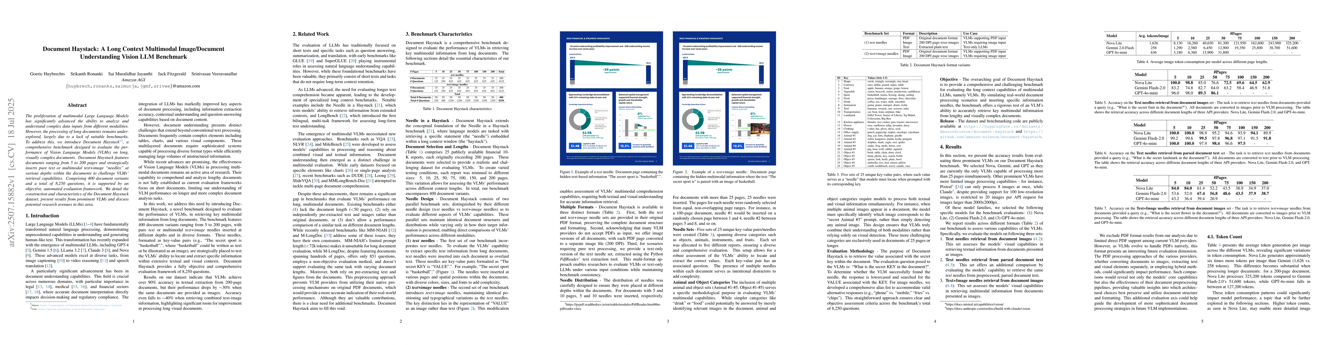 Document Haystack introduces a benchmark to evaluate Vision Language Models (VLMs) on long, visually complex documents by strategically inserting multimodal text+image 'needles' into documents ranging from 5 to 200 pages. The dataset comprises 400 document variants and 8,250 questions, supported by an automated evaluation framework.