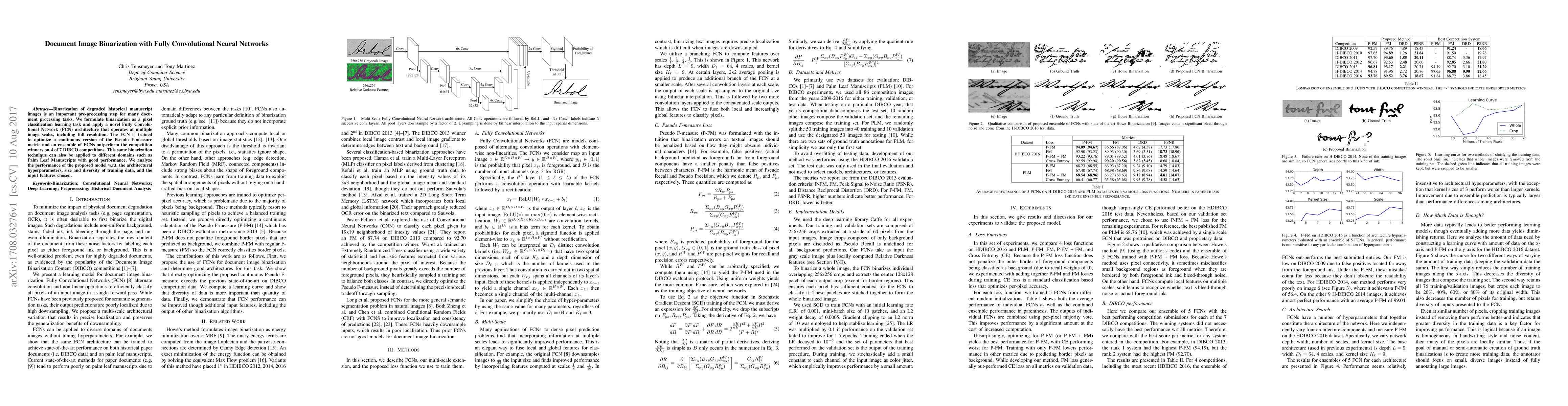 This paper proposes a Fully Convolutional Network (FCN) for binarizing degraded historical manuscript images, achieving top results in multiple DIBCO competitions. The FCN operates at multiple scales and optimizes a continuous Pseudo F-measure, demonstrating effectiveness across various document types.