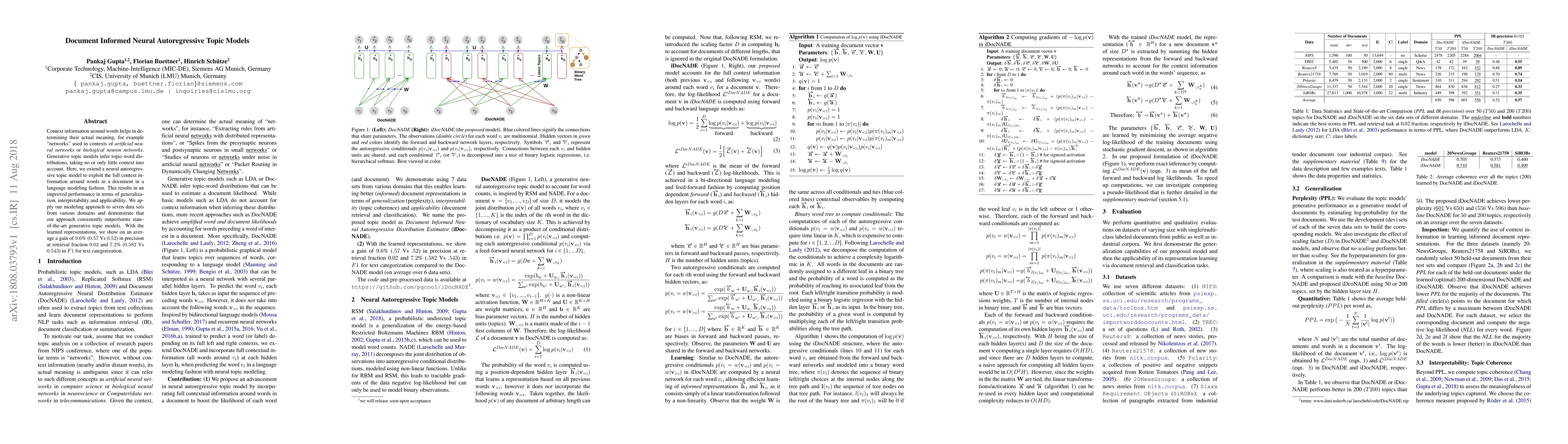 This paper proposes an informed neural autoregressive topic model that leverages full context information around words to improve topic modeling. The model outperforms state-of-the-art generative topic models across various domains, achieving a 9.6% gain in precision and a 7.2% improvement in F1 score for text categorization.
