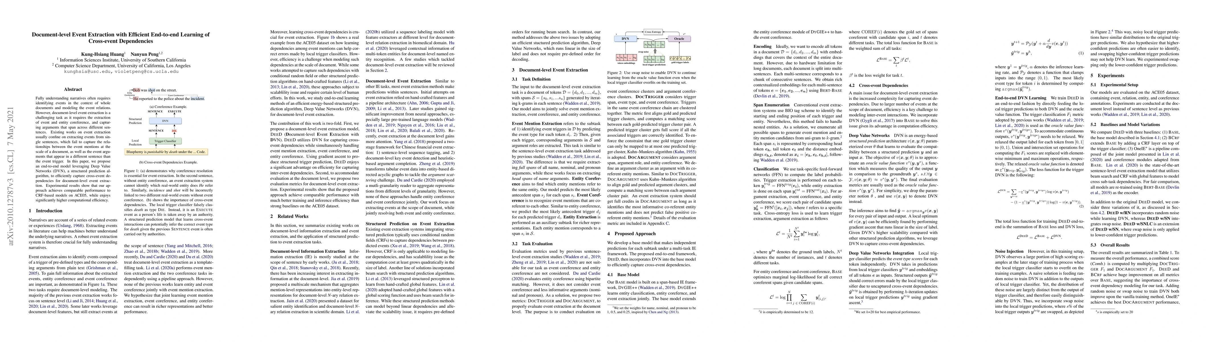 This paper proposes an efficient end-to-end model using Deep Value Networks for document-level event extraction, capturing cross-event dependencies and coreferences. The approach achieves comparable performance to CRF-based models while offering significantly higher computational efficiency.