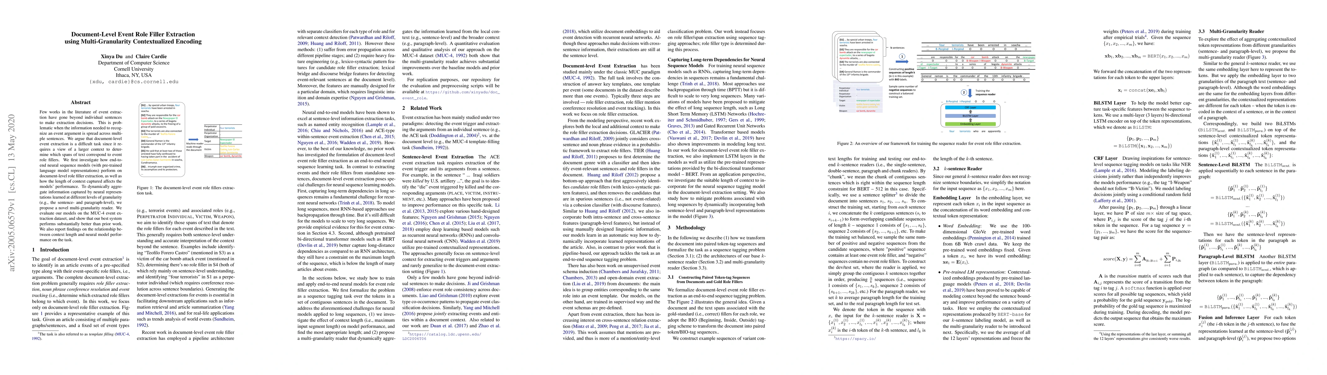 This paper explores document-level event role filler extraction using multi-granularity contextualized encoding, demonstrating that neural sequence models with pre-trained language representations can significantly improve performance when capturing larger context. The proposed multi-granularity reader dynamically aggregates information from different levels of granularity, outperforming prior work on the MUC-4 dataset.