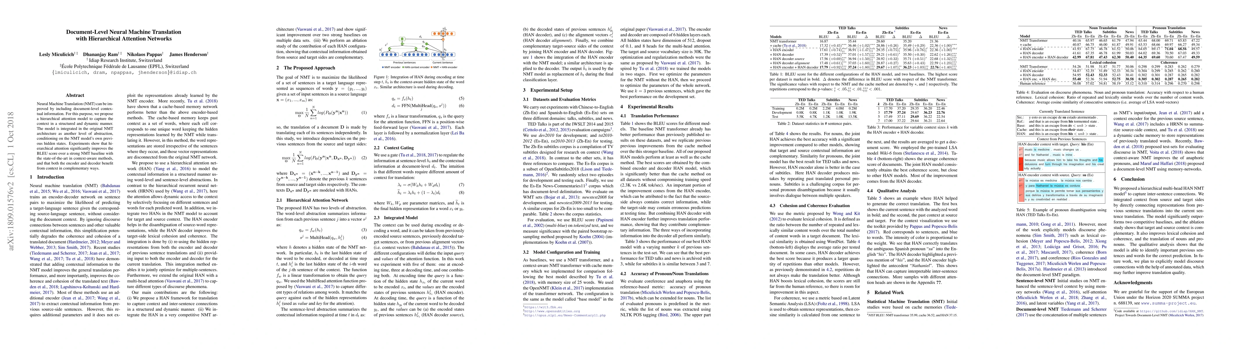 This paper proposes a hierarchical attention model to enhance Neural Machine Translation (NMT) by incorporating document-level contextual information. The model improves BLEU scores over strong baselines by dynamically capturing context, benefiting both the encoder and decoder in complementary ways.