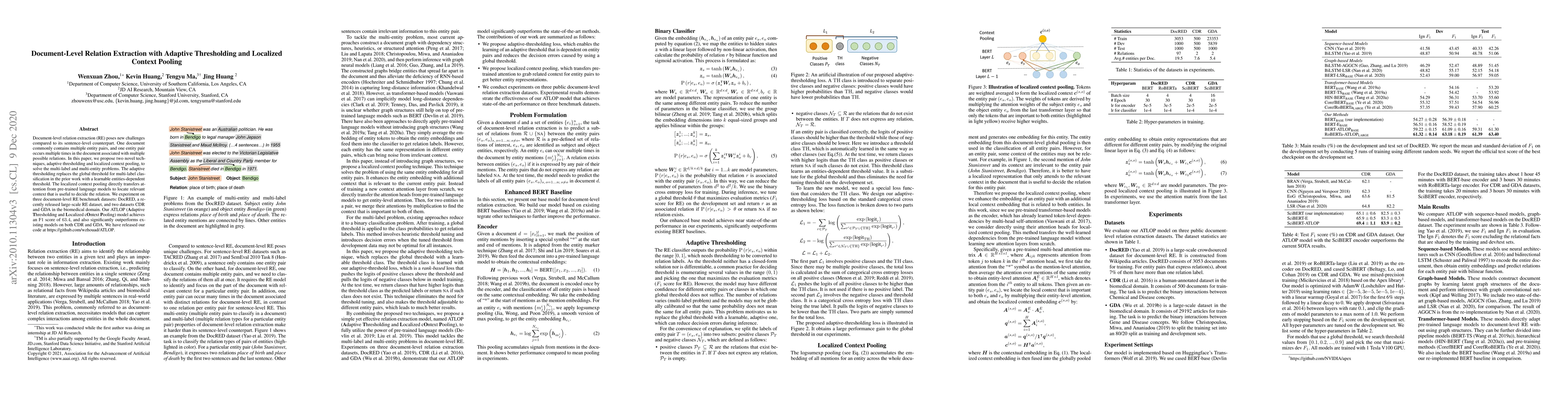 Document-level relation extraction (RE) poses new challenges compared to its sentence-level counterpart. One document commonly contains multiple entity pairs, and one entity pair occurs multiple times in the document associated with multiple possible relations. In this paper, we propose two novel techniques, adaptive thresholding and localized context pooling, to solve the multi-label and multi-entity problems. The adaptive thresholding replaces the global threshold for multi-label classification in the prior work with a learnable entities-dependent threshold. The localized context pooling directly transfers attention from pre-trained language models to locate relevant context that is useful to decide the relation. We experiment on three document-level RE benchmark datasets: DocRED, a recently released large-scale RE dataset, and two datasets CDRand GDA in the biomedical domain. Our ATLOP (Adaptive Thresholding and Localized cOntext Pooling) model achieves an F1 score of 63.4, and also significantly outperforms existing models on both CDR and GDA.