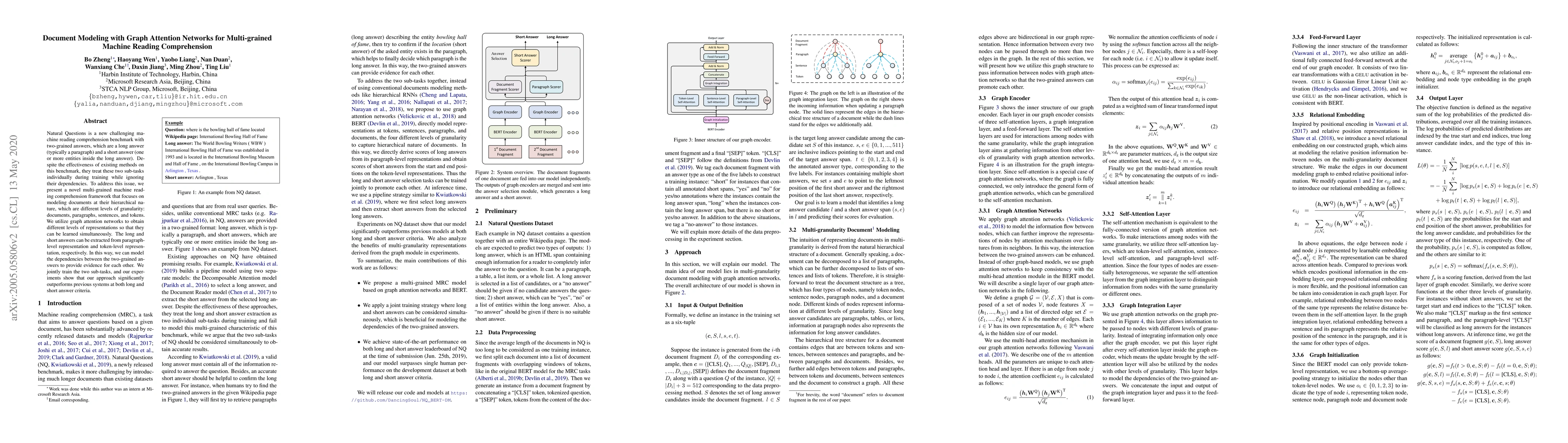 This paper proposes a multi-grained machine reading comprehension framework using graph attention networks to model documents at different levels of granularity. The approach jointly trains long and short answer extraction, capturing their dependencies, and outperforms previous methods on the Natural Questions benchmark.