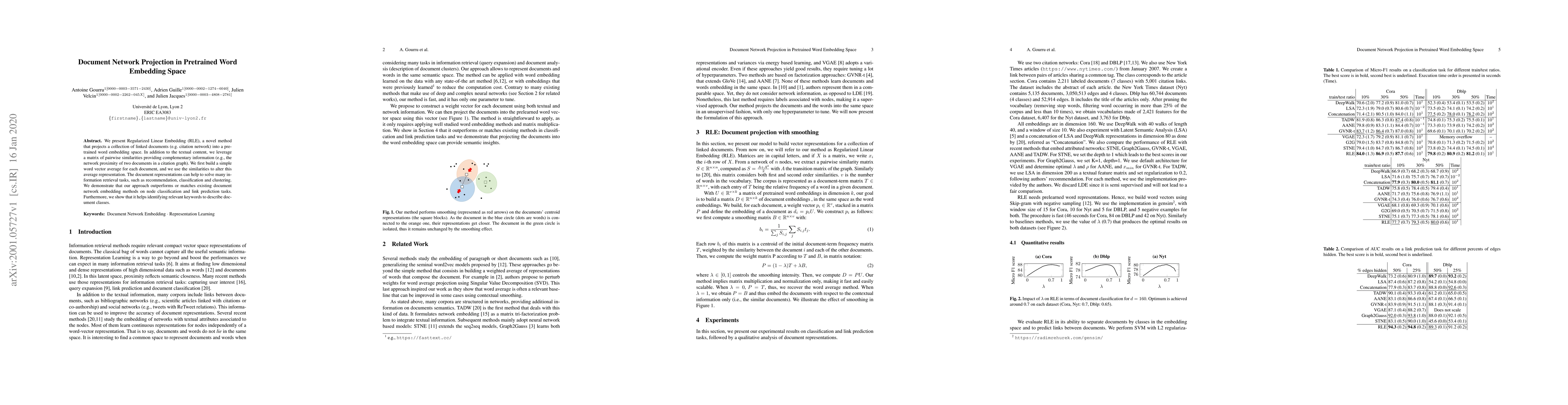 This paper introduces Regularized Linear Embedding (RLE), a method projecting linked documents into a pretrained word embedding space, incorporating network proximity information. RLE outperforms existing methods in node classification and link prediction, and aids in keyword identification for document class descriptions.