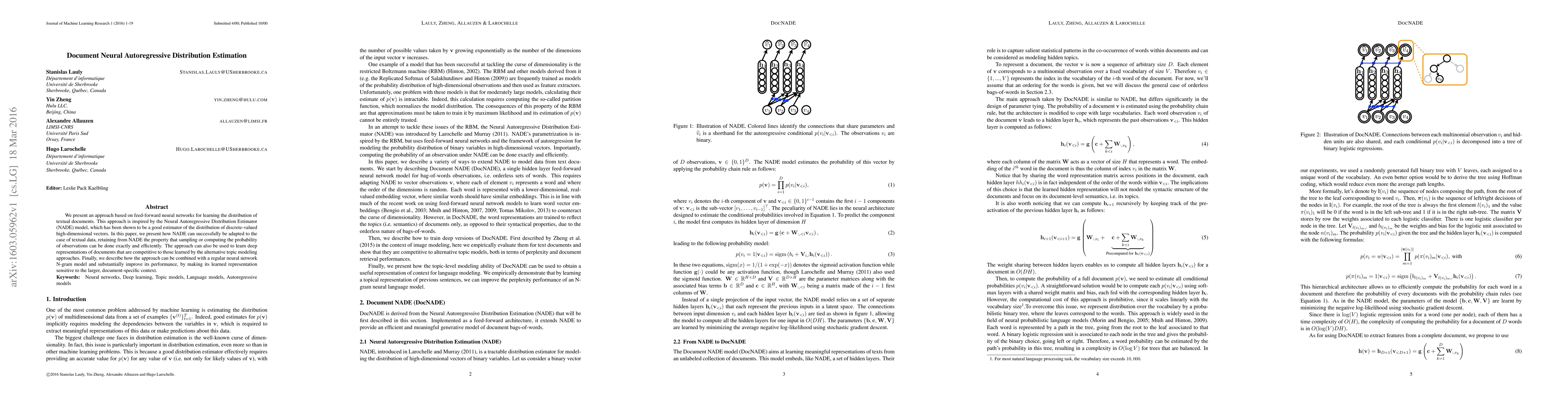 This paper adapts the Neural Autoregressive Distribution Estimator (NADE) for modeling textual documents, enabling exact and efficient sampling and probability computation. It also enhances document-specific context representation when combined with a neural network N-gram model.