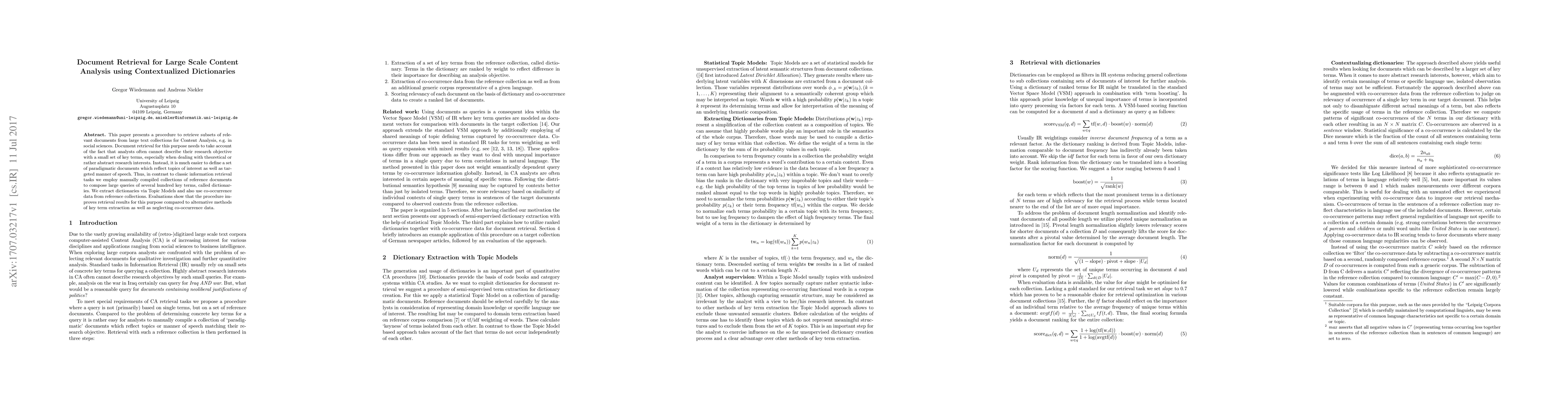 This paper presents a procedure to retrieve subsets of relevant documents from large text collections for Content Analysis, e.g. in social sciences. Document retrieval for this purpose needs to take account of the fact that analysts often cannot describe their research objective with a small set of key terms, especially when dealing with theoretical or rather abstract research interests. Instead, it is much easier to define a set of paradigmatic documents which reflect topics of interest as well as targeted manner of speech. Thus, in contrast to classic information retrieval tasks we employ manually compiled collections of reference documents to compose large queries of several hundred key terms, called dictionaries. We extract dictionaries via Topic Models and also use co-occurrence data from reference collections. Evaluations show that the procedure improves retrieval results for this purpose compared to alternative methods of key term extraction as well as neglecting co-occurrence data.