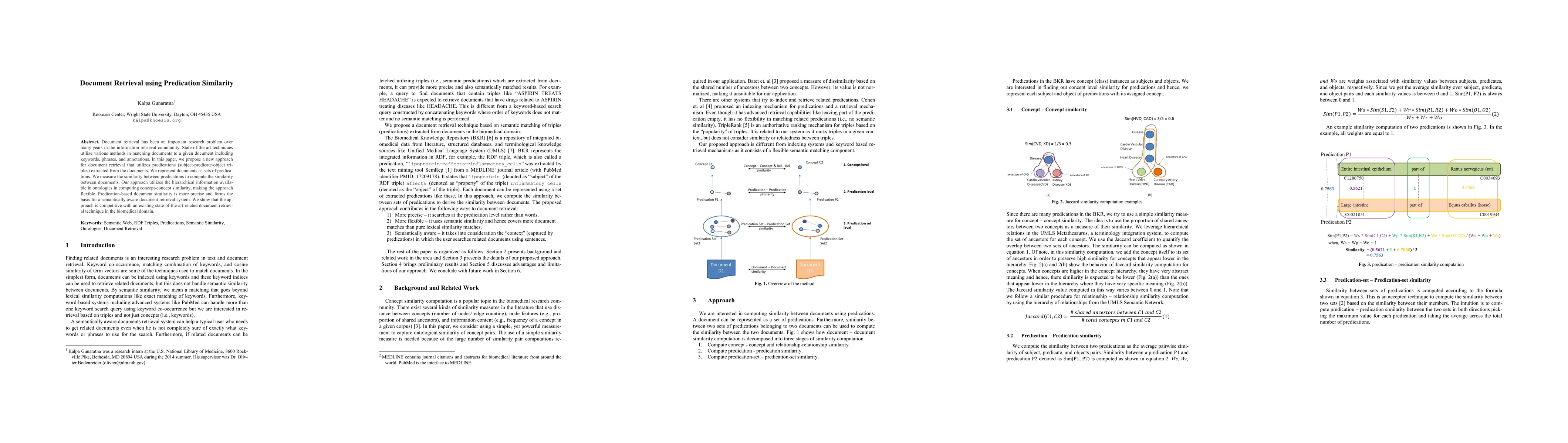 This paper proposes a novel document retrieval method using predications (subject-predicate-object triples) extracted from documents, representing them as sets of predications and computing similarity based on concept-concept similarity derived from ontologies. The approach demonstrates competitive performance in the biomedical domain.