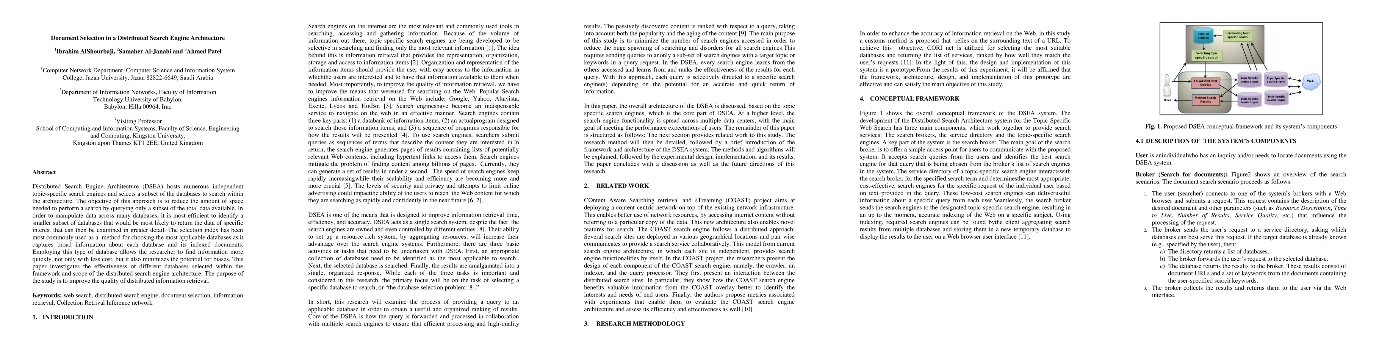 Distributed Search Engine Architecture (DSEA) hosts numerous independent topic-specific search engines and selects a subset of the databases to search within the architecture. The objective of this approach is to reduce the amount of space needed to perform a search by querying only a subset of the total data available. In order to manipulate data across many databases, it is most efficient to identify a smaller subset of databases that would be most likely to return the data of specific interest that can then be examined in greater detail. The selection index has been most commonly used as a method for choosing the most applicable databases as it captures broad information about each database and its indexed documents. Employing this type of database allows the researcher to find information more quickly, not only with less cost, but it also minimizes the potential for biases. This paper investigates the effectiveness of different databases selected within the framework and scope of the distributed search engine architecture. The purpose of the study is to improve the quality of distributed information retrieval.