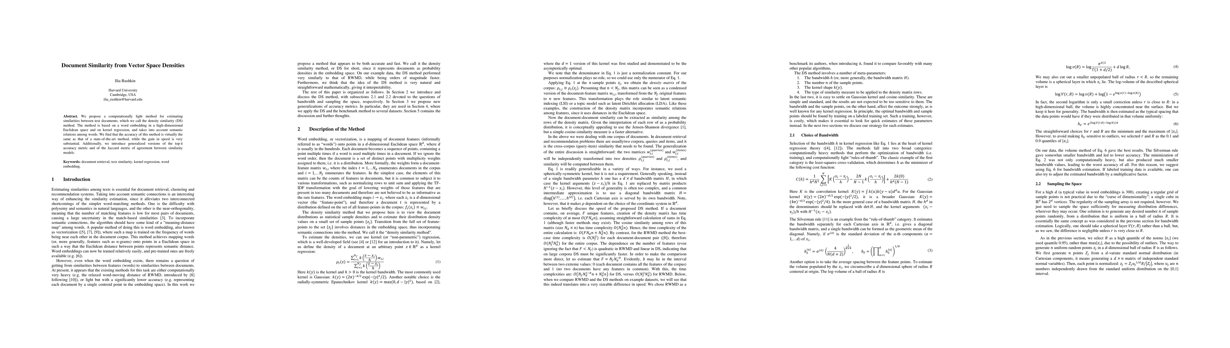 We propose a computationally light method for estimating similarities between text documents, which we call the density similarity (DS) method. The method is based on a word embedding in a high-dimensional Euclidean space and on kernel regression, and takes into account semantic relations among words. We find that the accuracy of this method is virtually the same as that of a state-of-the-art method, while the gain in speed is very substantial. Additionally, we introduce generalized versions of the top-k accuracy metric and of the Jaccard metric of agreement between similarity models.