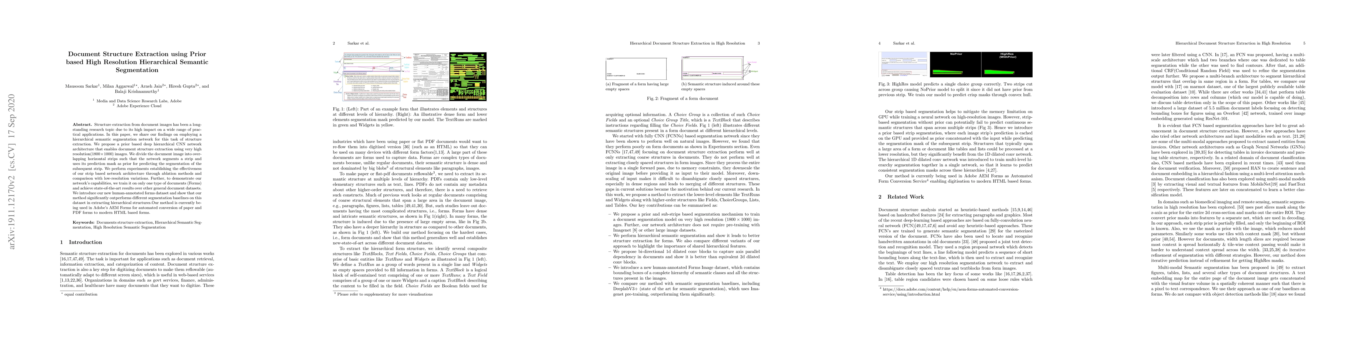 Structure extraction from document images has been a long-standing research topic due to its high impact on a wide range of practical applications. In this paper, we share our findings on employing a hierarchical semantic segmentation network for this task of structure extraction. We propose a prior based deep hierarchical CNN network architecture that enables document structure extraction using very high resolution(1800 x 1000) images. We divide the document image into overlapping horizontal strips such that the network segments a strip and uses its prediction mask as prior for predicting the segmentation of the subsequent strip. We perform experiments establishing the effectiveness of our strip based network architecture through ablation methods and comparison with low-resolution variations. Further, to demonstrate our network's capabilities, we train it on only one type of documents (Forms) and achieve state-of-the-art results over other general document datasets. We introduce our new human-annotated forms dataset and show that our method significantly outperforms different segmentation baselines on this dataset in extracting hierarchical structures. Our method is currently being used in Adobe's AEM Forms for automated conversion of paper and PDF forms to modern HTML based forms.