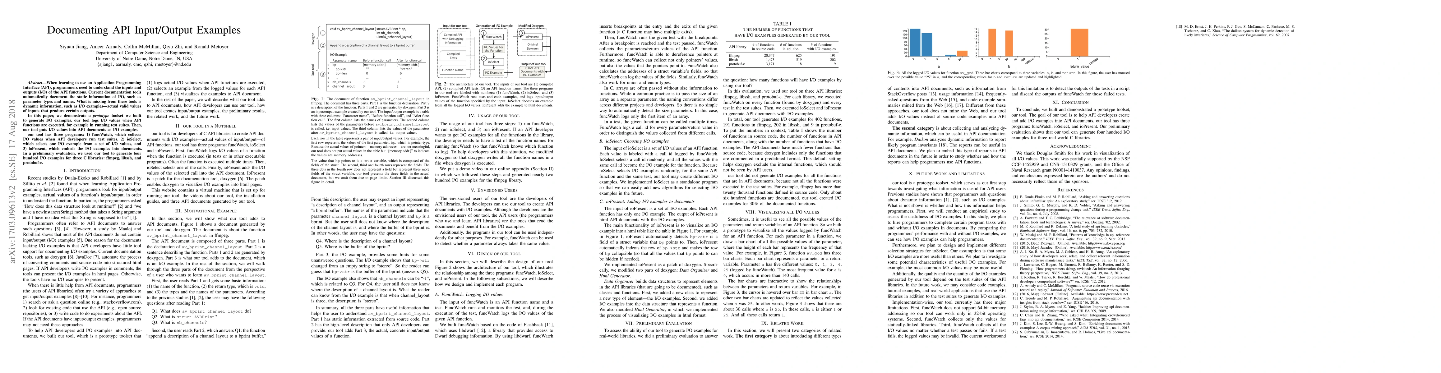 The paper presents a novel approach to enrich API documentation with dynamic I/O examples, using a three-program toolset (funcWatch, ioSelect, and ioPresent) that logs, selects, and presents these examples.