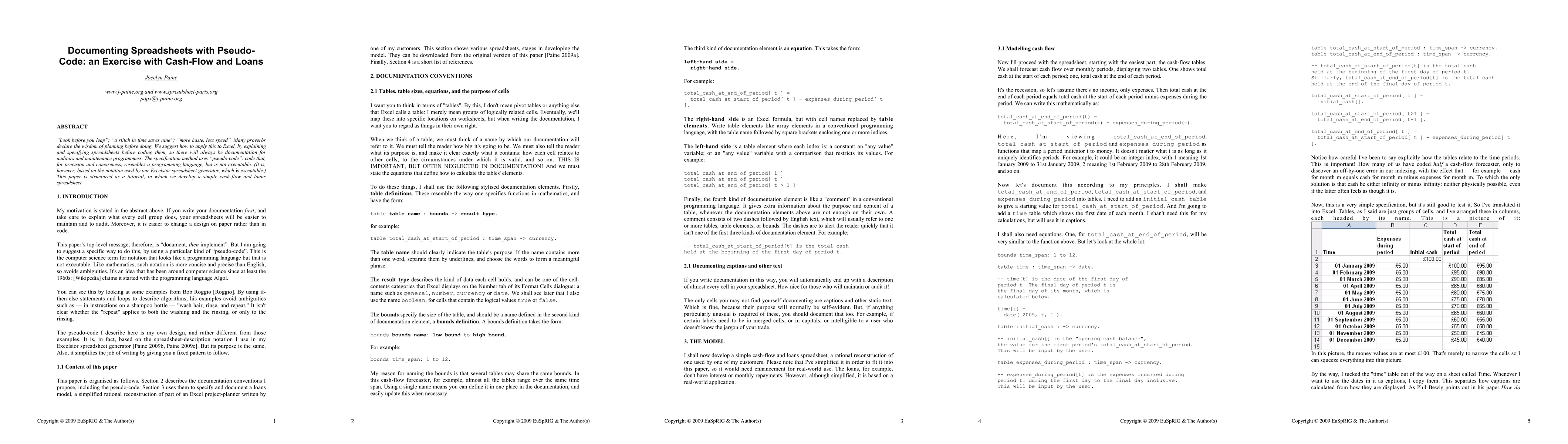 This paper proposes a method to document Excel spreadsheets using pseudo-code before actual coding, ensuring clear documentation for auditors and maintenance. The tutorial demonstrates this approach through a simple cash-flow and loans spreadsheet, aligning pseudo-code with the executable notation of the Excelsior spreadsheet generator.