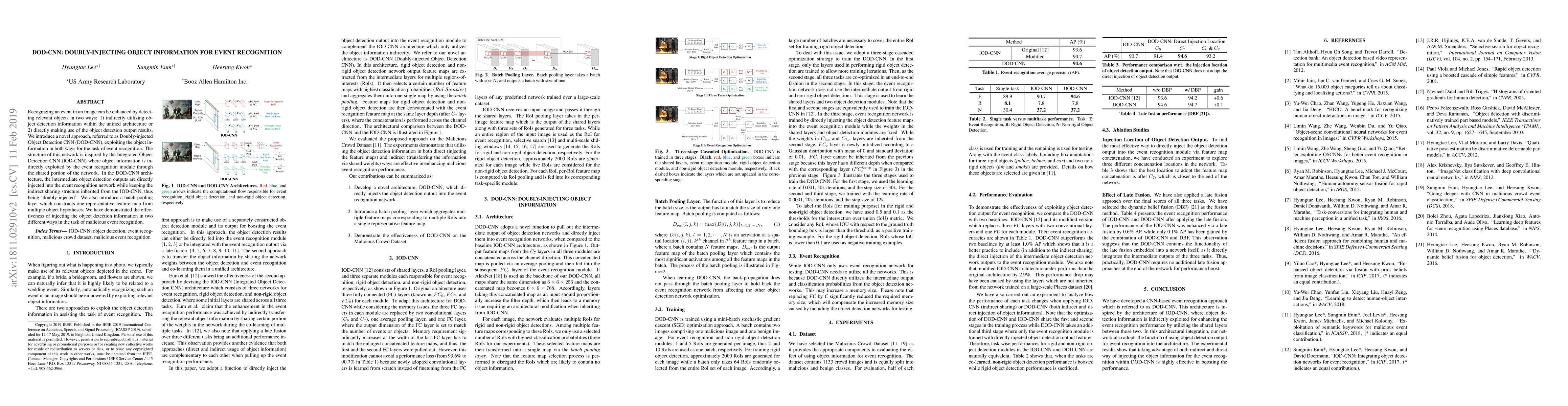 Recognizing an event in an image can be enhanced by detecting relevant objects in two ways: 1) indirectly utilizing object detection information within the unified architecture or 2) directly making use of the object detection output results. We introduce a novel approach, referred to as Doubly-injected Object Detection CNN (DOD-CNN), exploiting the object information in both ways for the task of event recognition. The structure of this network is inspired by the Integrated Object Detection CNN (IOD-CNN) where object information is indirectly exploited by the event recognition module through the shared portion of the network. In the DOD-CNN architecture, the intermediate object detection outputs are directly injected into the event recognition network while keeping the indirect sharing structure inherited from the IOD-CNN, thus being `doubly-injected'. We also introduce a batch pooling layer which constructs one representative feature map from multiple object hypotheses. We have demonstrated the effectiveness of injecting the object detection information in two different ways in the task of malicious event recognition.